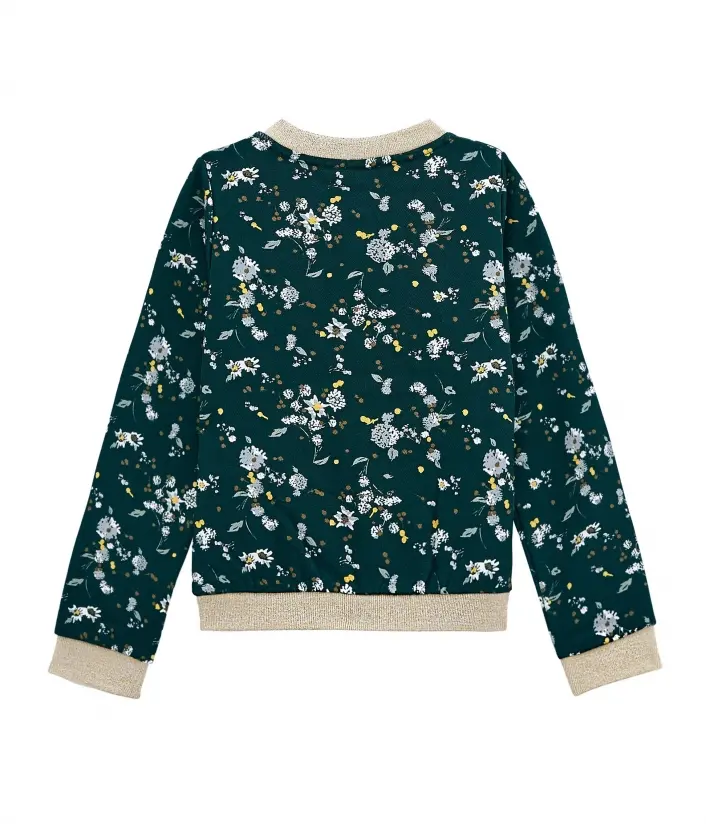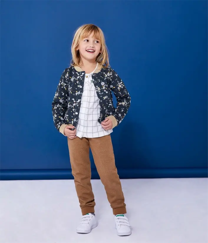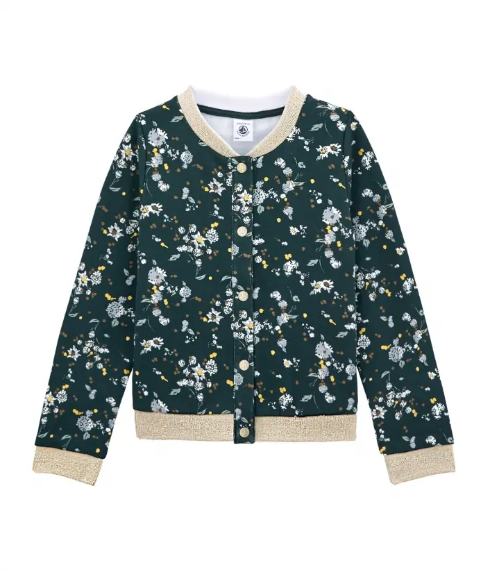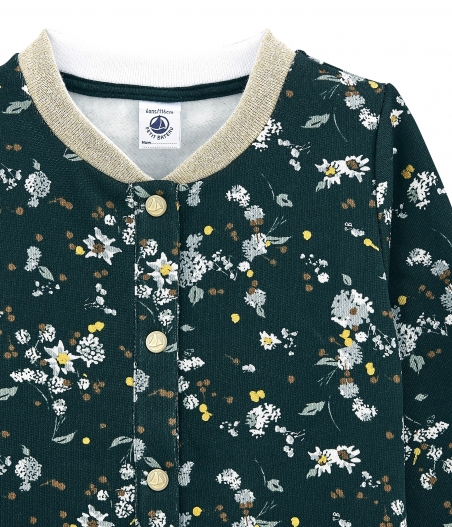 Кардиган из теплого хлопкового трикотажа с цветочным принтом. Золотистая окантовка горловины, рукавов и нижнего края изделия прекрасно подчеркивает его. Застегивается на золотистые кнопочки с логотипом Petit Bateau. Состав: 100% хлопок / 66% хлопок, 18% полиэстер, 13% полиамид, 3% эластан