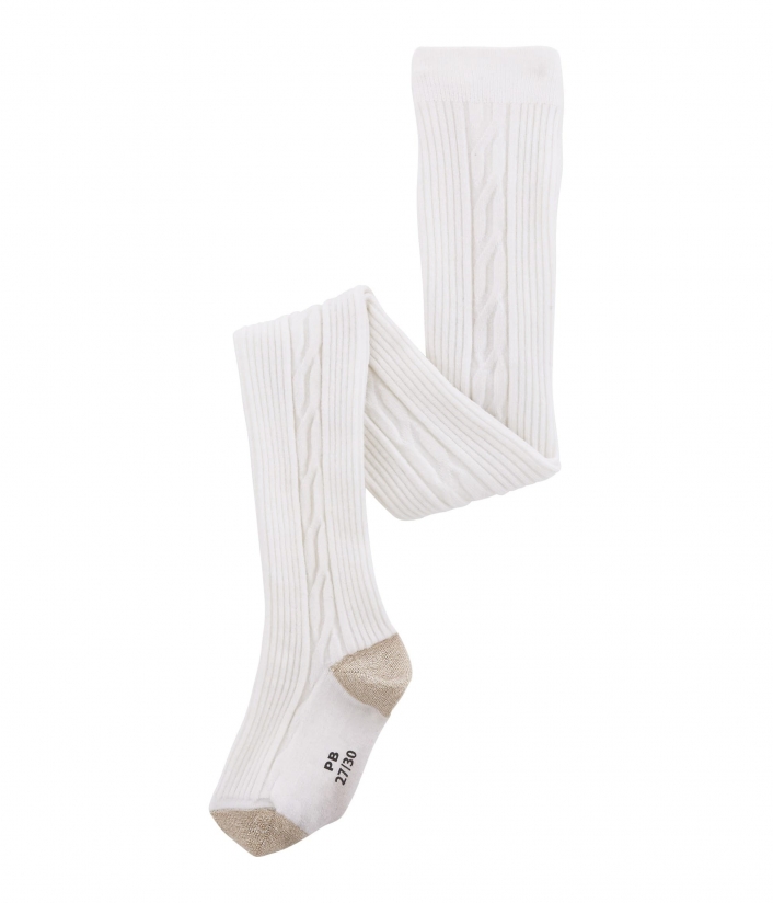Теплые вязаные колготки молочного цвета маст-хэв зимой. Они имеют контрастные золотистые вставки снизу, придающие им дополнительный шарм. Традиционно на стопе имеют отпечаток инициалов Petit Bateau с определенным размером. Состав 61% шерсть, 33% полиамид, 2% вискоза, 1% металлизированная фибра, 1% полиэстер, 2% эластан