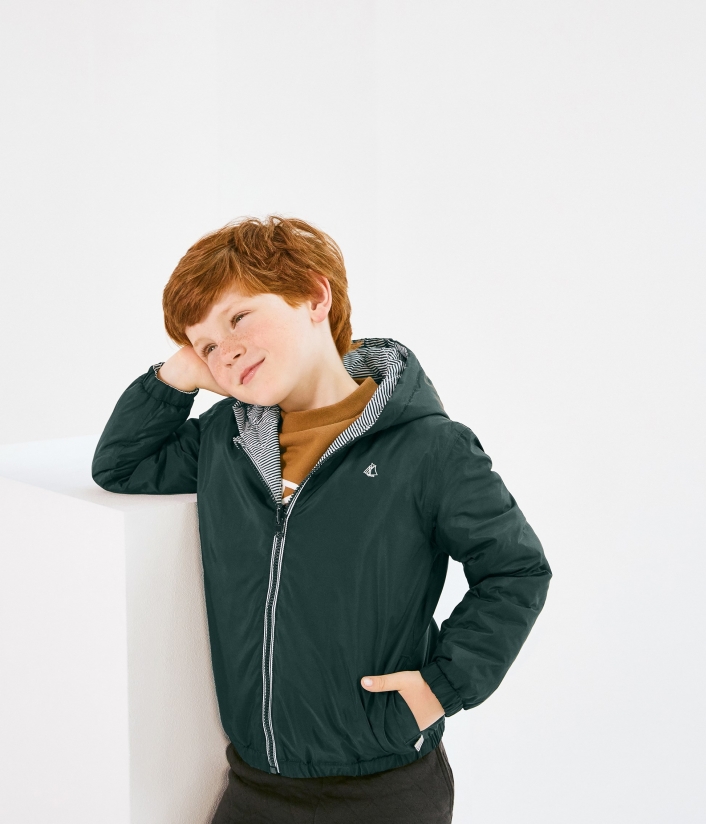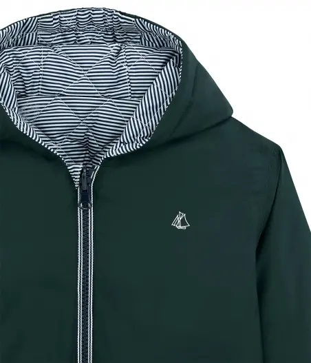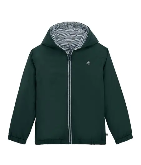 Petit Bateau разработал теплую ветронепроницаемую и водостойкую двустороннюю куртку. Одна сторона, сшитая из однотонного полиэстера, а другая - в традиционную полоску. Легко застегивается на молнию. Знаковым является принт парусника Petit Bateau впереди. Рекомендуем носить под плащ или пальто зимой, или отдельно. Состав: 100% полиэстер