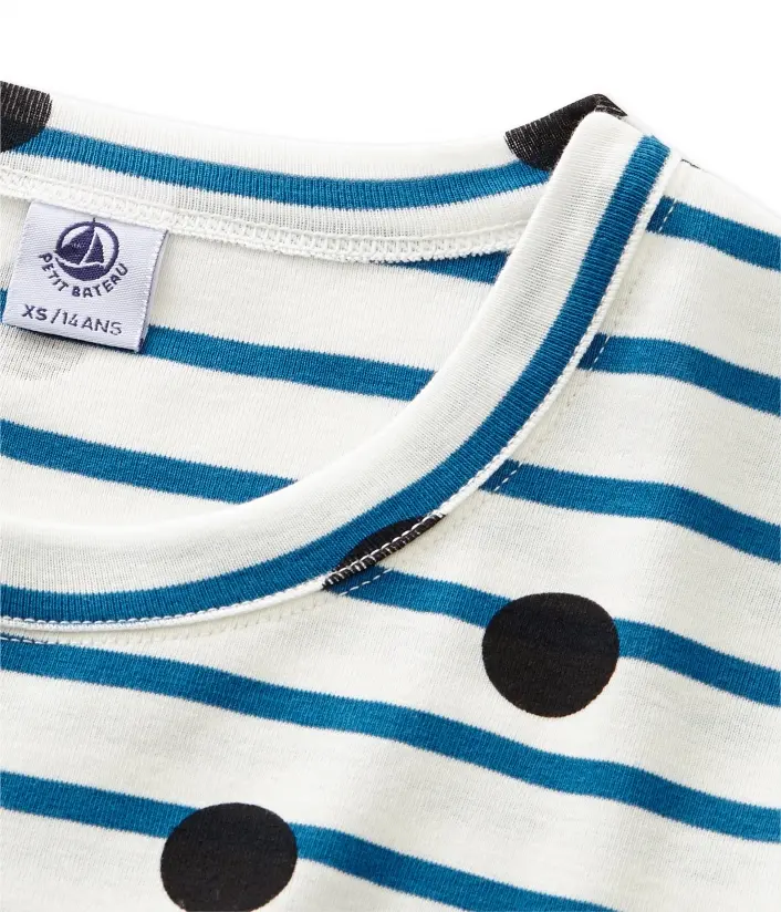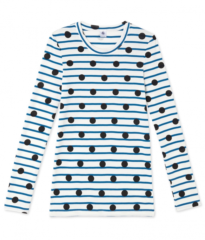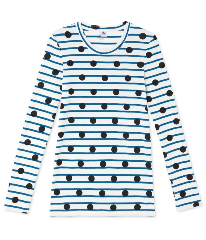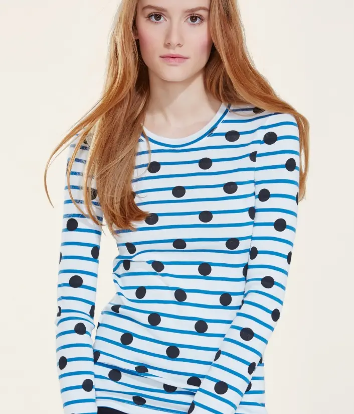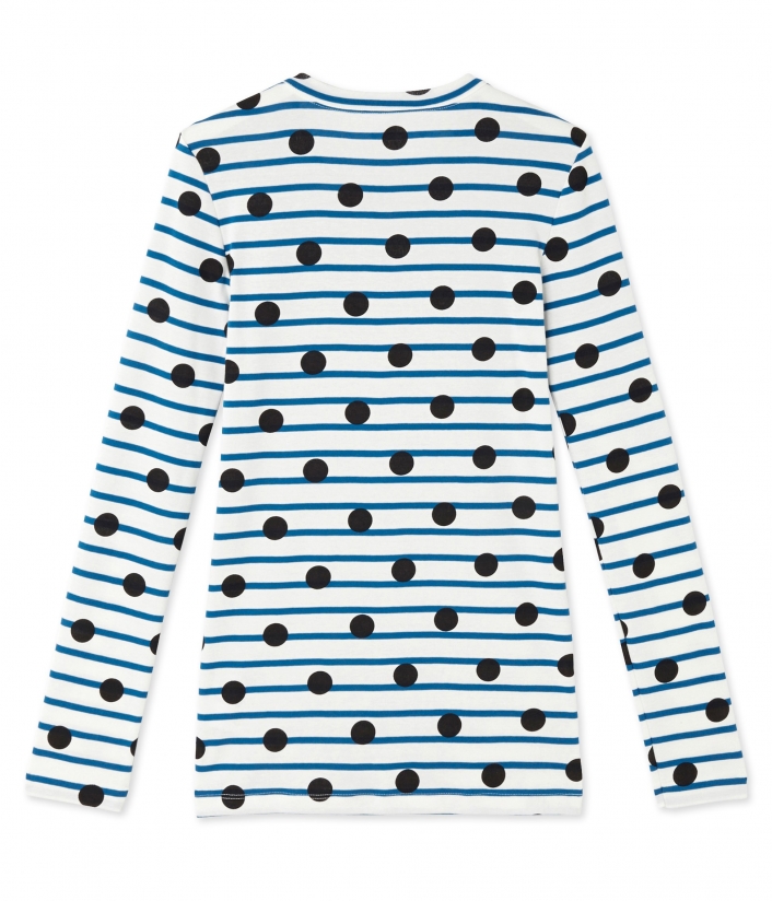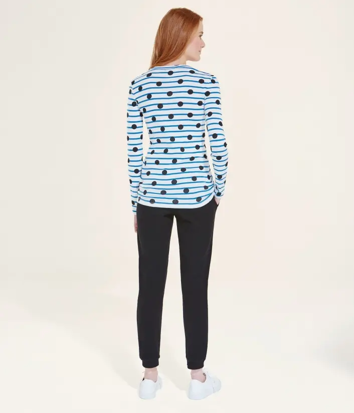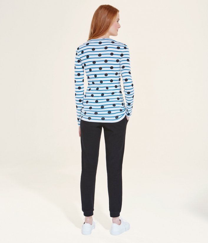 Женская футболка с длинными рукавами и круглым вырезом. Изготовлена из полосатой ткани, украшенной черным горошком. Материал: 100% хлопок.