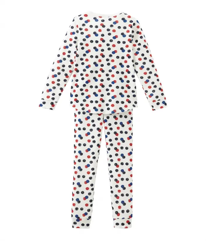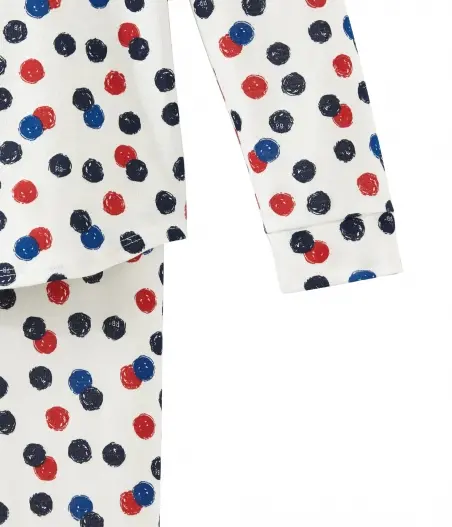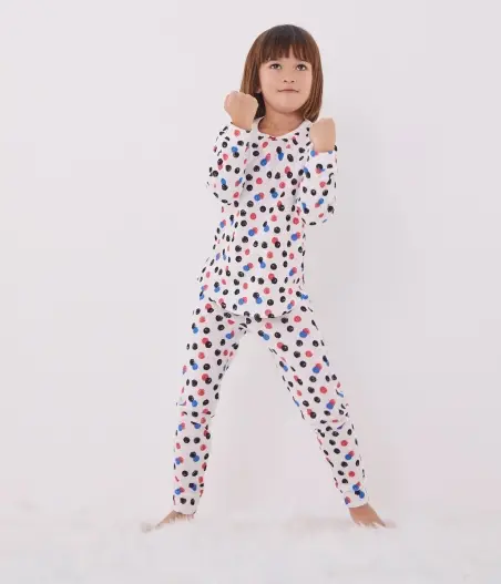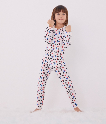 Піжама для дівчинки прикрашена різнокольоровим горошком. Вона м'яка та комфортна, приємно прилягає до шкіри. Рукава футболки та брюки з манжетами. OEKO-TEX® гарантує безпечність для шкіри. Склад: 100% унікальна бавовна