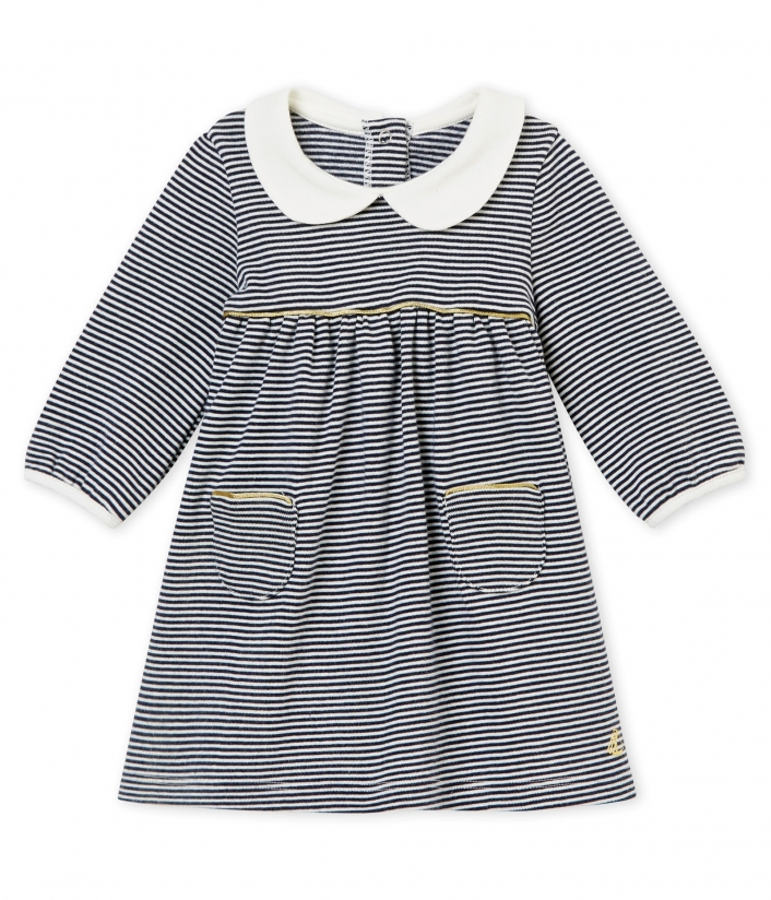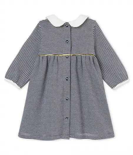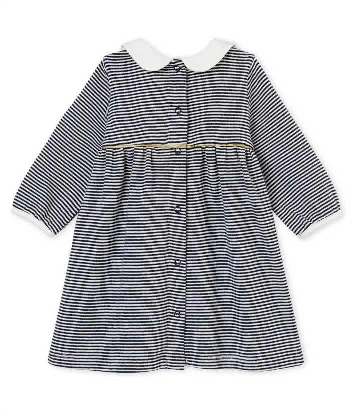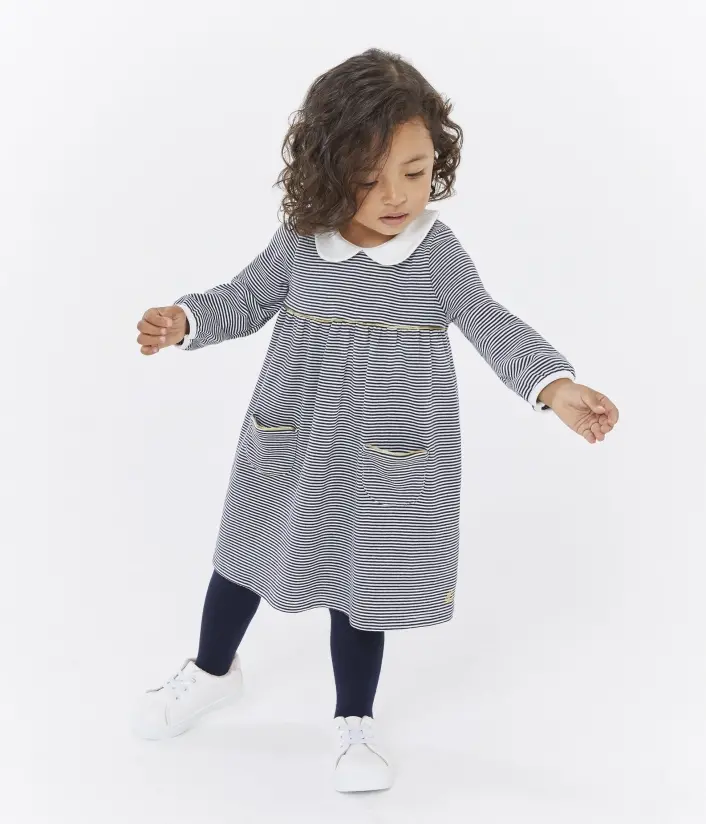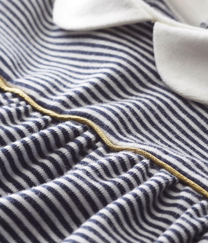 Сукня у традиційну смужку Petit Bateau декорована золотистими деталями та білим коміром типу "Пітер Пен". Закруглені кишені, вітрильник Petit Bateau спереду, зручні застібки на кнопочки ззаду. Еластичний та приємний на дотик матеріал. Дівчинка прекрасно виглядатиме в цій чудовій сукні. Склад: 100% бавовна
