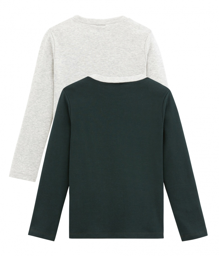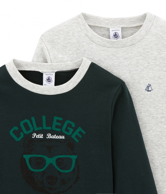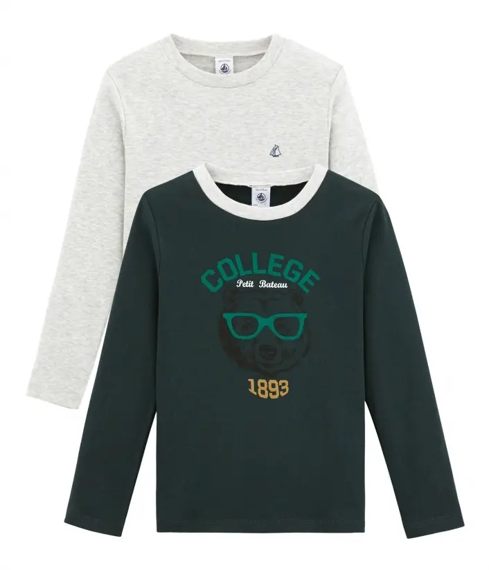 У наборі дві футболки з довгими рукавами: однотонна із знаковим принтом вітрильника Petit Bateau, з контрастною горловиною та принтом мордочки ведмедика в окулярах, надписом College Petit Bateau 1893 (фр. переклад "коледж Petit Bateau 1893". 1893 - рік заснування трикотажної фабрики Petit Bateau у місті Труа, Франція). Комбінуйте під одяг. Обов'язкові у гардеробі хлопчика. Склад: 100% бавовна