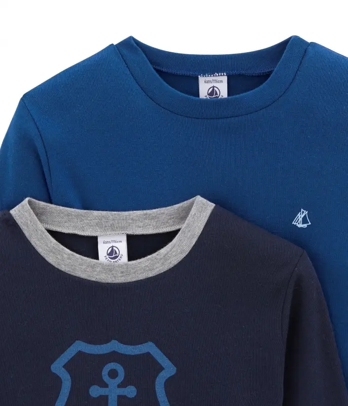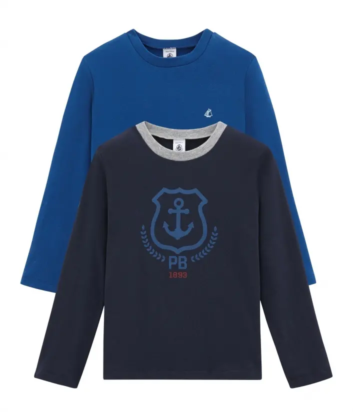 В наборе две футболки с длинными рукавами: однотонная с знаковым принтом парусника Petit Bateau, с контрастной горловиной и принтом якоря и инициалов Petit Bateau 1893 (1893 - год основания трикотажной фабрики Petit Bateau в городе Труа, Франция). Комбинируйте под одежду. Обязательные в гардеробе мальчика. Состав: 100% хлопок