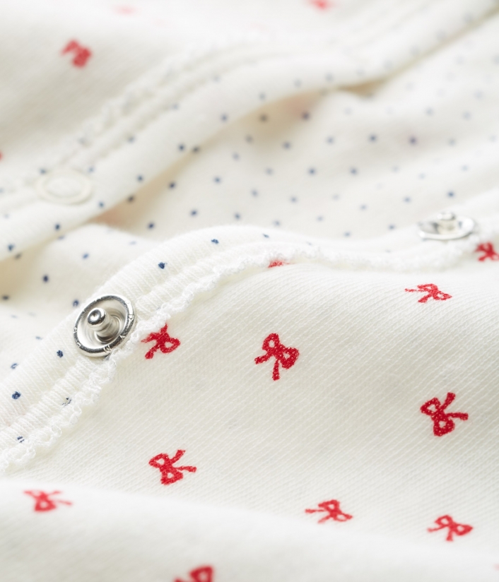 • Піжама-комбінезон з принтом бантиків ззовні, а з внутрішньої сторони - з принтом горошку. • Застібки на кнопочки для зручнішого перевдягання. • Товар сертифікований OEKO-TEX® Standart 100, що надає впевненості у безпечності та якості одягу. • Гіпоалергенність - матеріал не викликає подразнень шкіри, та будь-яких інших симптомів алергічної реакції. Склад: 100% бавовна