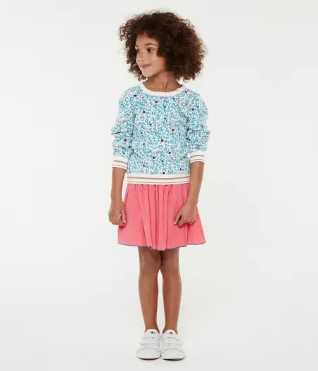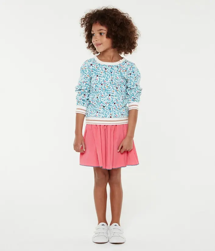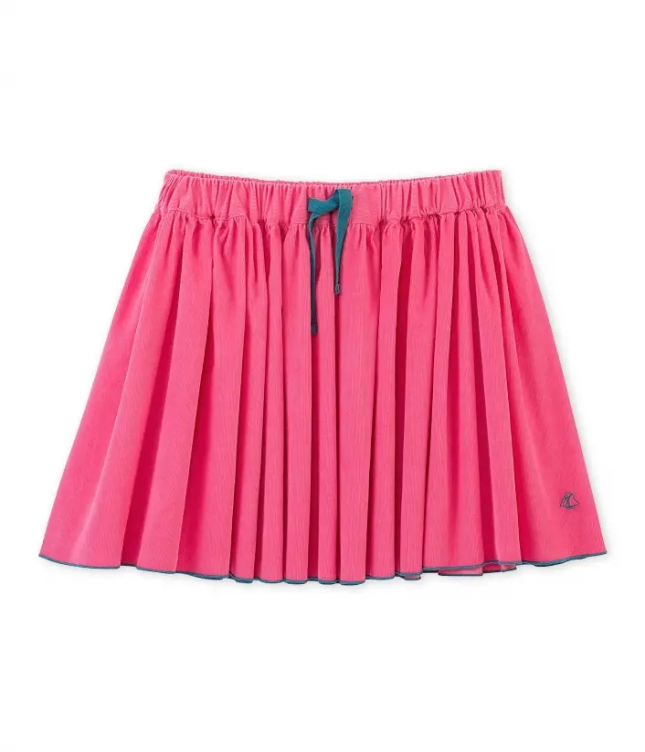 Велюрова спідниця-кльош для дівчинки, оздоблена паском контрастного кольору. Низ спідниці декорований обстрочкою в тон паска. Матеріал: 100% бавовна.