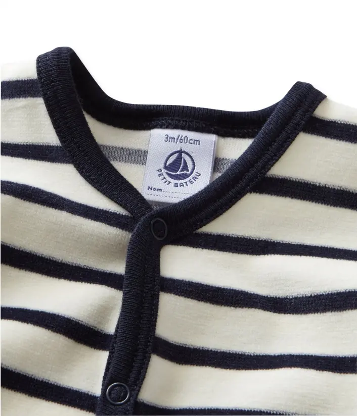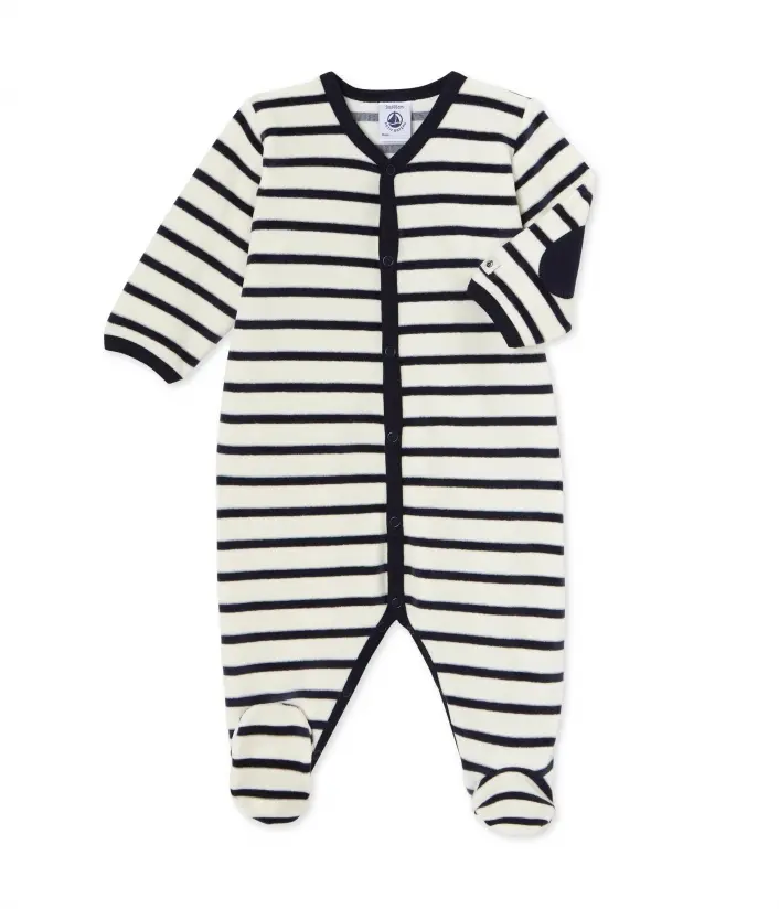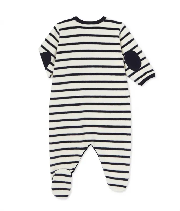 Велюрова піжама в смужку з довгими рукавами. Піжама прикрашена накладками з контрастної тканини на ліктях . Піжама оздоблена зручними застібками по всій довжині. Матеріал: 80% бавовна, 20% поліестер.