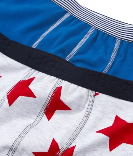 • У наборі двоє трусів-боксерів: однотонні, з принтом зірочок. • Еластичний пояс. • Чудово пасуватиме з футболкою чи майкою, що має схожу кольорову гаму. • Товар сертифікований OEKO-TEX® Standart 100, що надає впевненості у безпечності та якості одягу. • Гіпоалергенність - матеріал не викликає подразнень шкіри, та будь-яких інших симптомів алергічної реакції. Склад: 93% бавовна, 7% еластан / 94% бавовна, 6% еластан