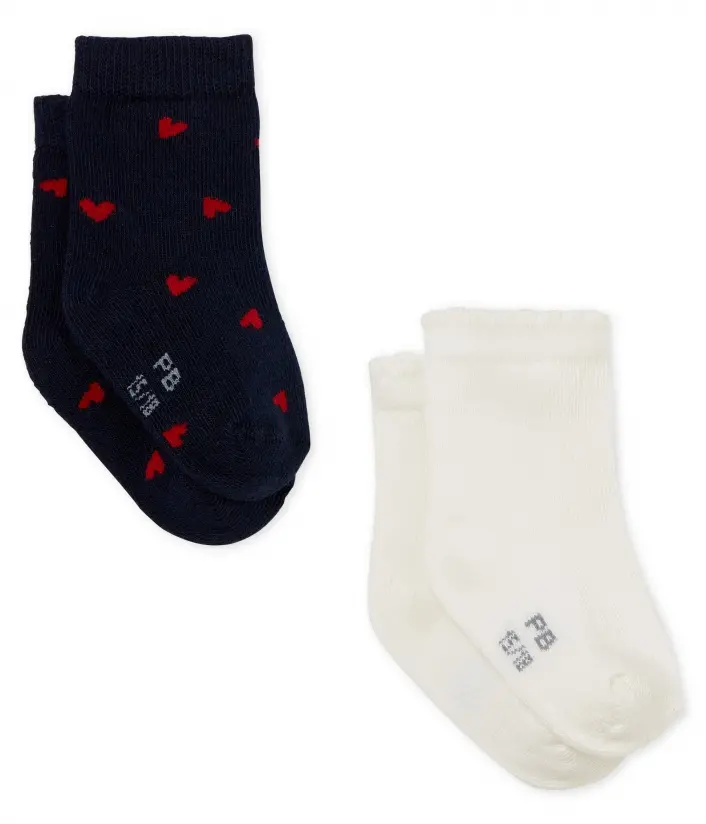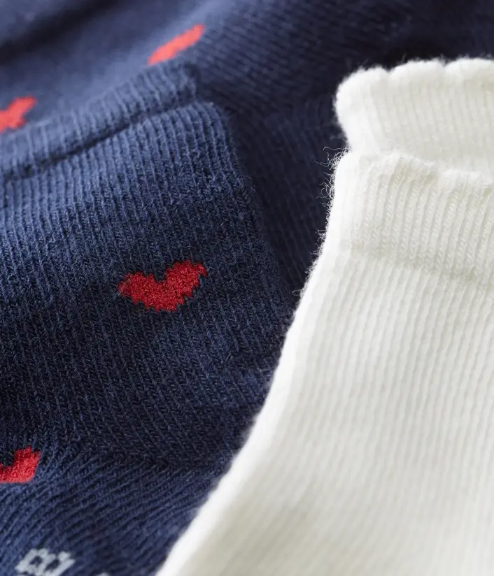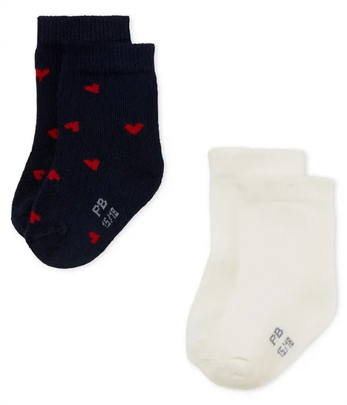 • Дві пари милих шкарпеток для малечі чудово довершать образ. • Одна пара шкарпеток прикрашена принтом сердець, друга - однотонного кольору. • Традиційно на ступні має відбиток ініціалів Petit Bateau з певним розміром. Довжина ступні: 15/18 = 7,4-8,3 см; 19/22 = 9,7- 10,6 см. Склад: 85% бавовна, 13% поліамід, 2% еластан / 87% бавовна, 11% поліестер, 2% еластан