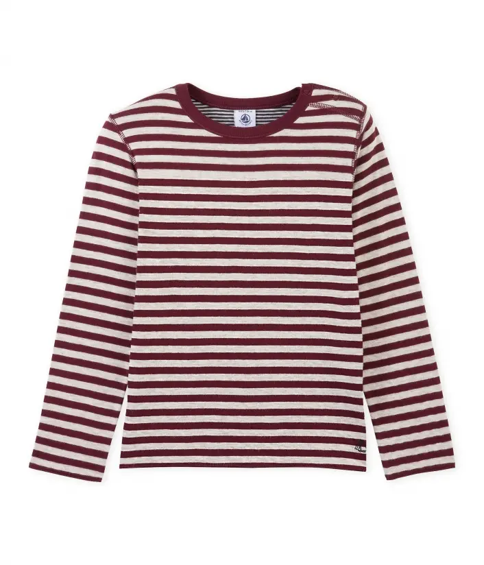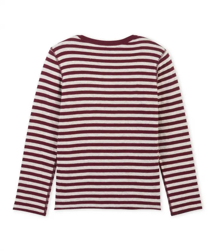Мягкая, теплая футболка с длинными рукавами для мальчика, изготовленная из двуслойного трикотажа в полоску. Футболка имеет застежку на плече. Материал: 100% хлопок.