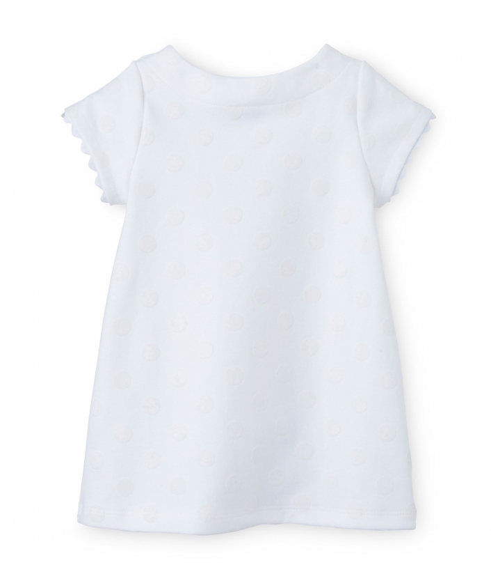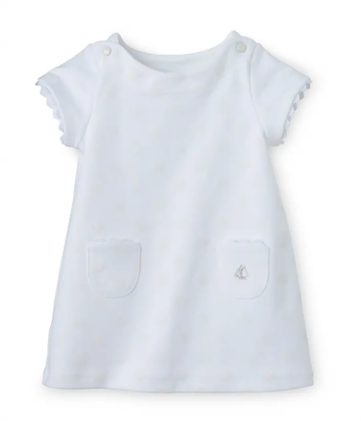 Сукня з короткими рукавами для дівчинки, виготовлена з трикотажу у об'ємний горошок. Ця чудова сукня А-подібного силуету дозволяє дитині вільно рухатись і почувати себе насправді комфортно. Сукня має дві накладні кишеньки спереду, застібки-кнопки на плечах. Матеріал: 100% бавовна.