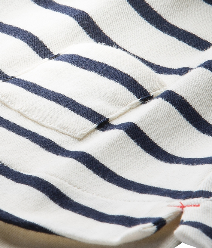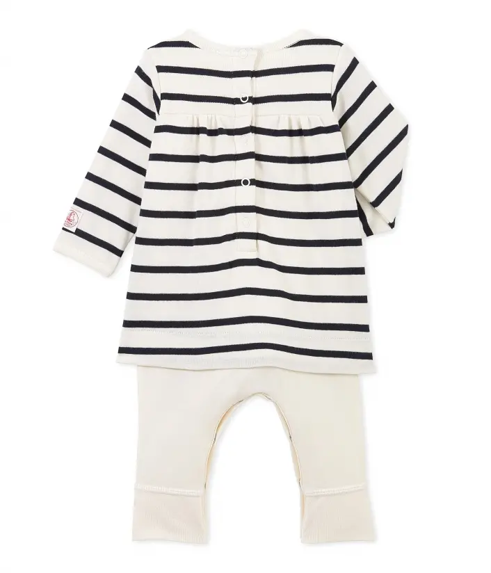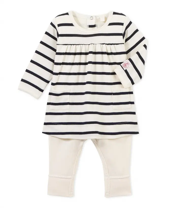 До набору входить сукня з довгими рукавами і легінси. Сукня виготовлена з бавовняного трикотажу в широку смужку і оздоблена застібками на спинці. Сукня прикрашена двома маленькими кишенями спереду. Легінси мають зручні застібки між ніжок. Матеріал: 100% бавовна.