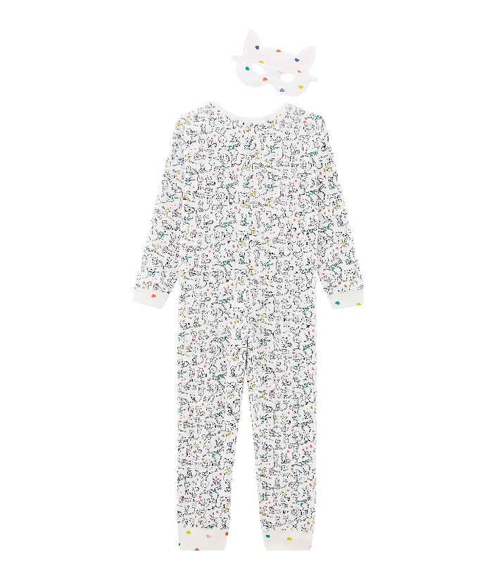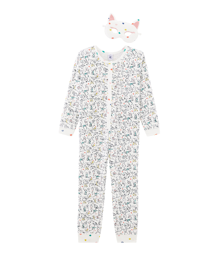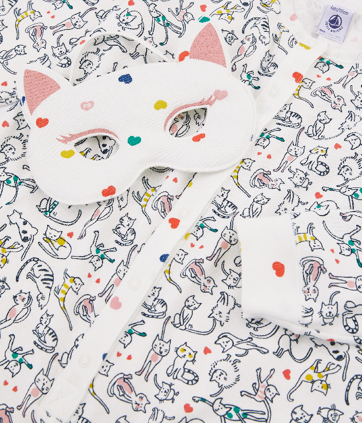 Пижама-комбинезон для девочки с маской для сна. Она украшена принтом котиков. Комфортная, стильная и невероятно мягкая пижама. Товар сертифицирован OEKO-TEX® Standart 100, что дает уверенность в безопасности и качестве одежды. Состав: 100% хлопок / 100% полиамид