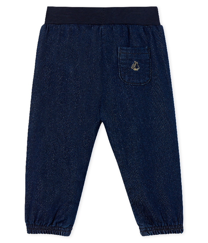 Джинсові брюки для немовляти. Еластичний пояс прикрашений милим бантиком. Штанці декоровані однією кишенею ззаду. Склад: 88% бавовна, 11% поліамід, 1% еластан / 100% бавовна