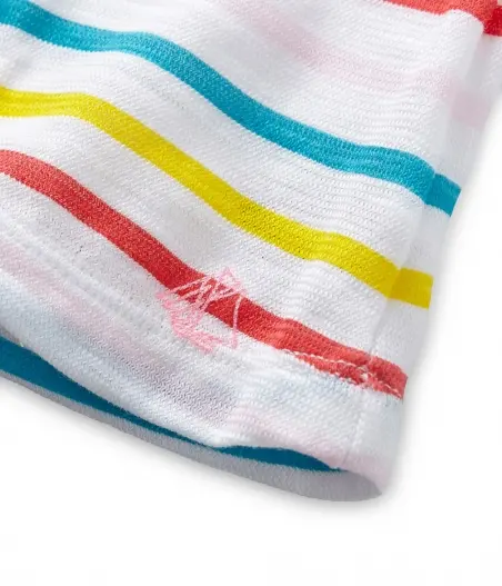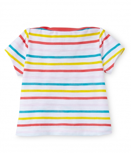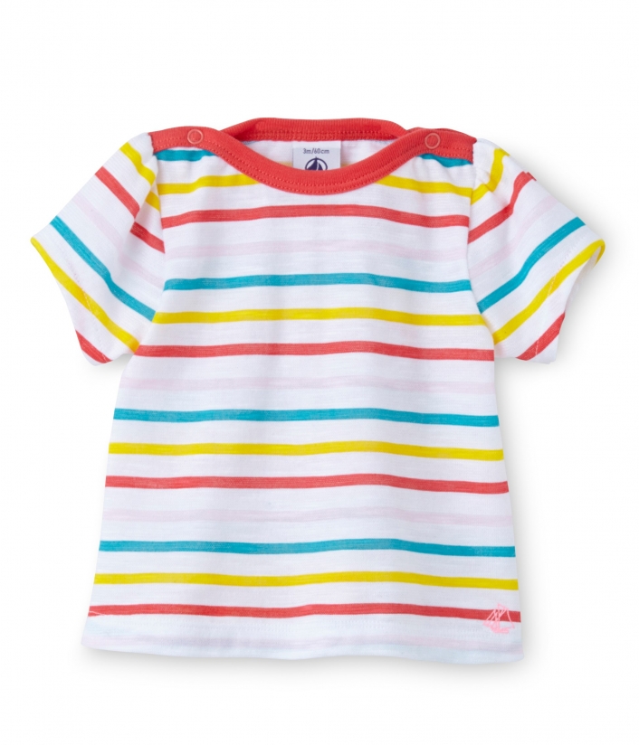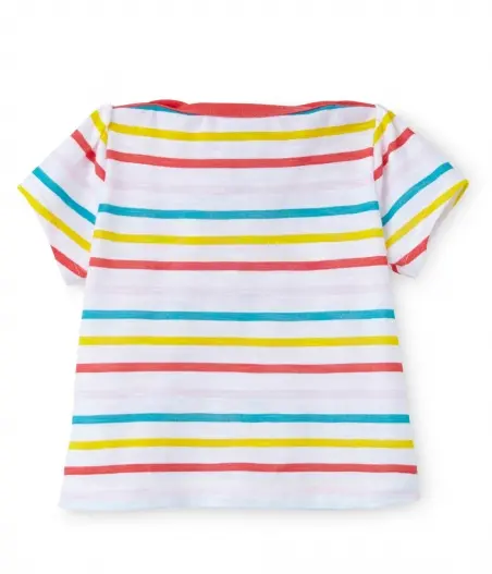 Футболка з короткими рукавами для дівчинки, виготовлена з трикотажу у різнокольорову смужку. Футболка оздоблена зручними застібками-кнопками на плечах. Матеріал: 100% бавовна.