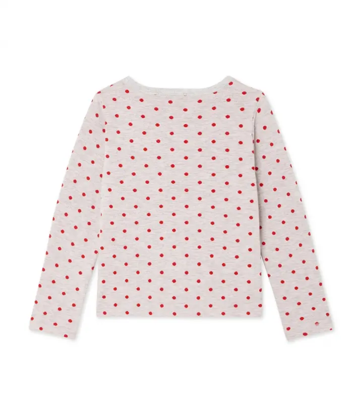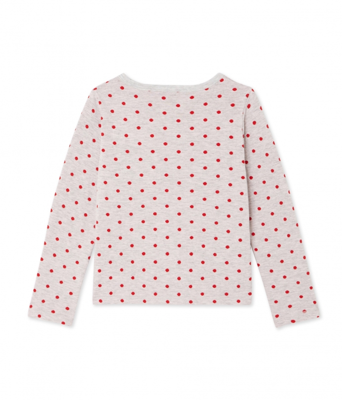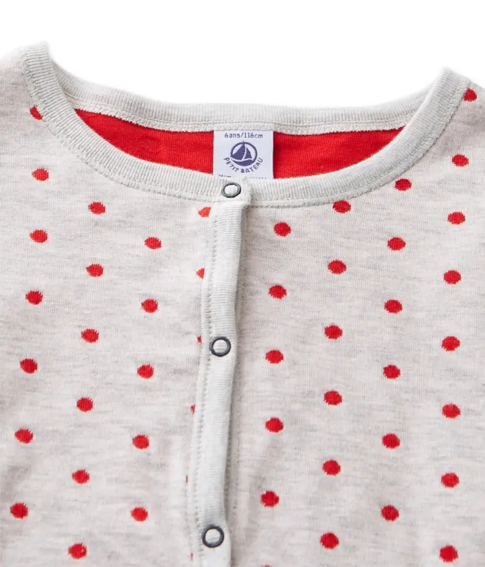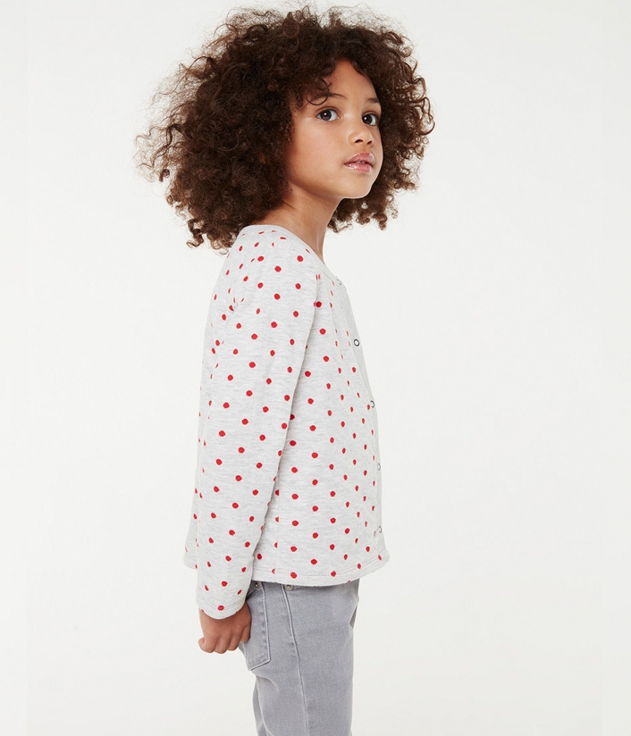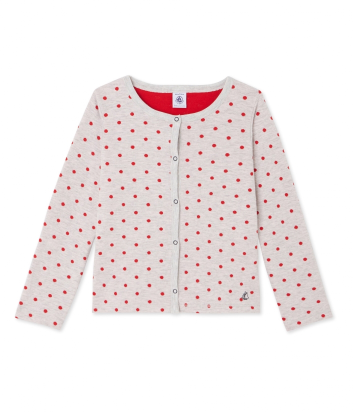 Кардиган для дівчинки, виготовлений з двошарової тканини: однобарвної всередині, зовні - у горошок. Кардиган має застібку на кнопки. Гарна та практична річ для створення модного образу. Матеріал: 100% бавовна.