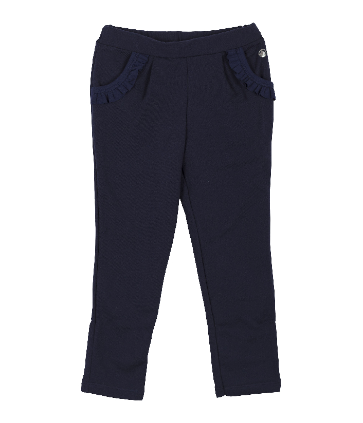 Трикотажные брюки для девочки прямого покроя. Два кармана спереди украшены рюшами. Состав: 100% хлопок