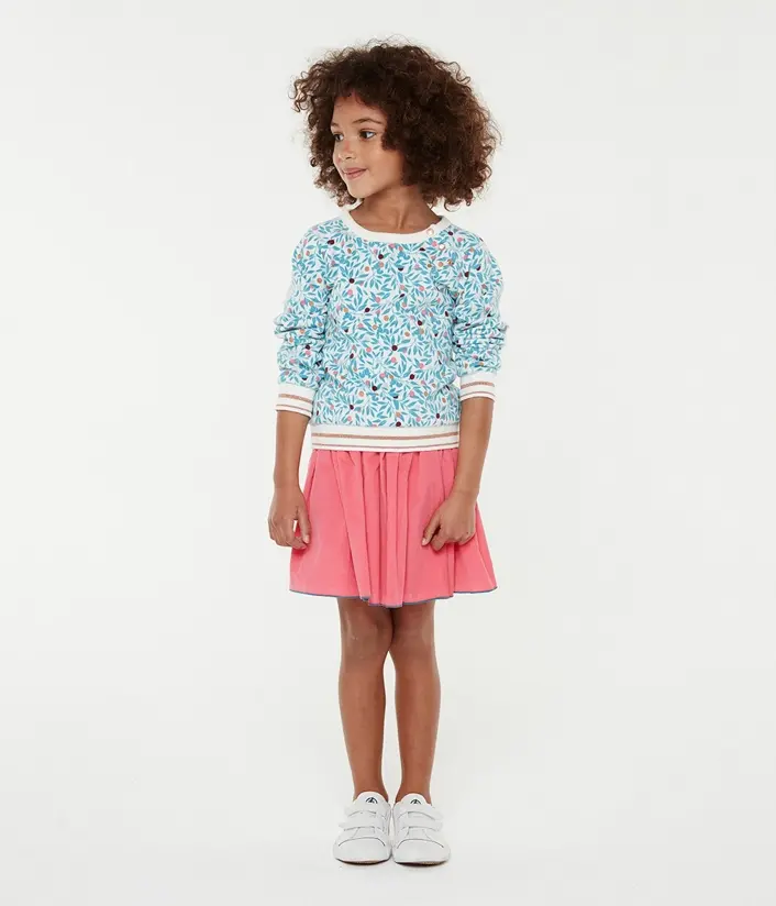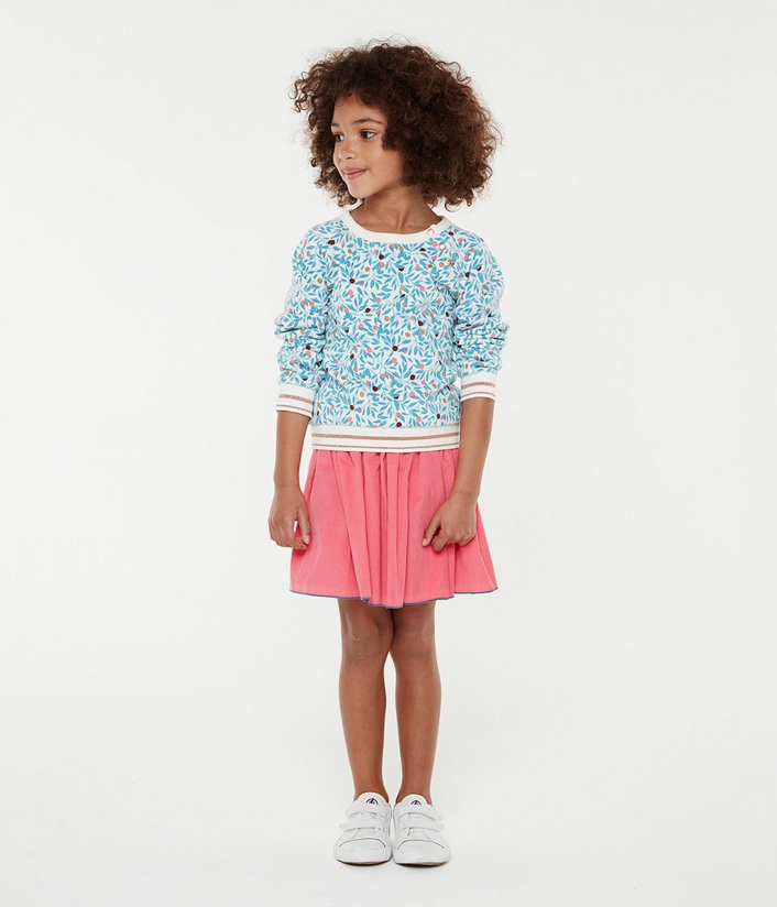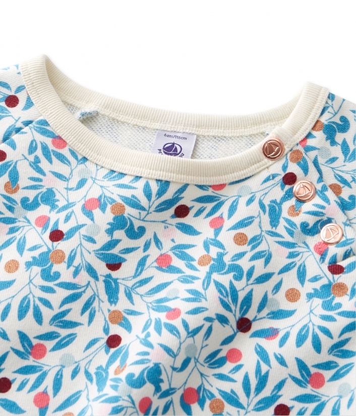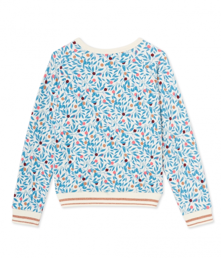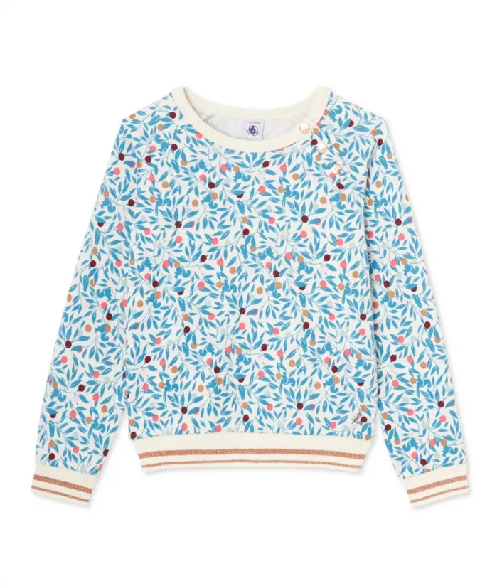 Свитшот для девочки, изготовленный з теплой, мягкой ткани с растительным принтом. Обратите внимание на прекрасные детали этого свитшота: кнопки с изображением логотипа Petit Bareau и отделку манжетов люрексом. Модный свитшот для стильных девочек. Материал: 100% хлопок.