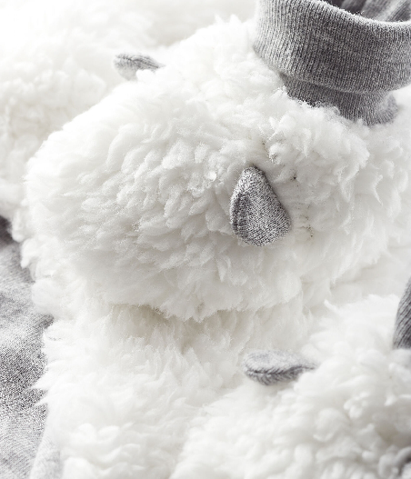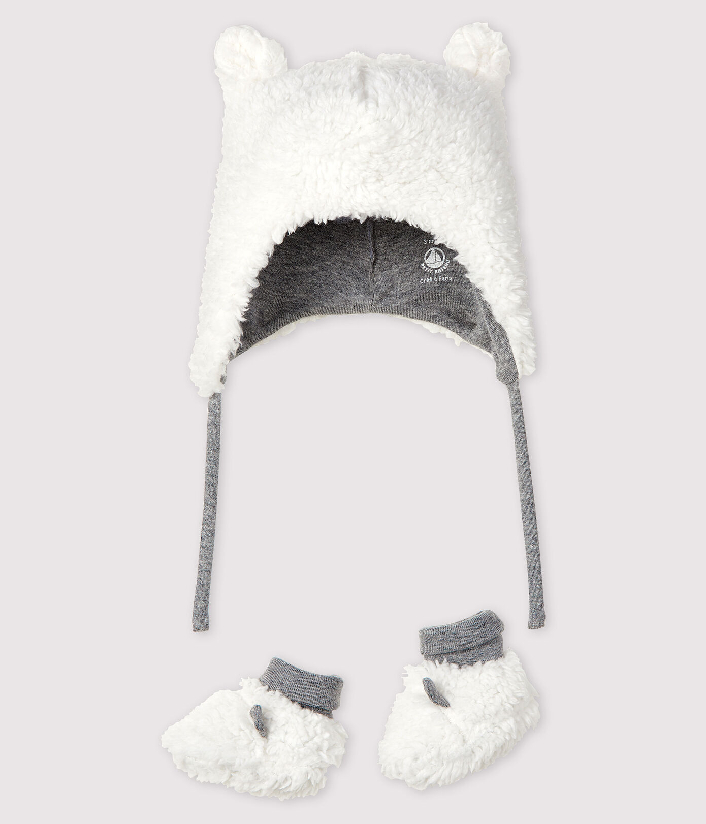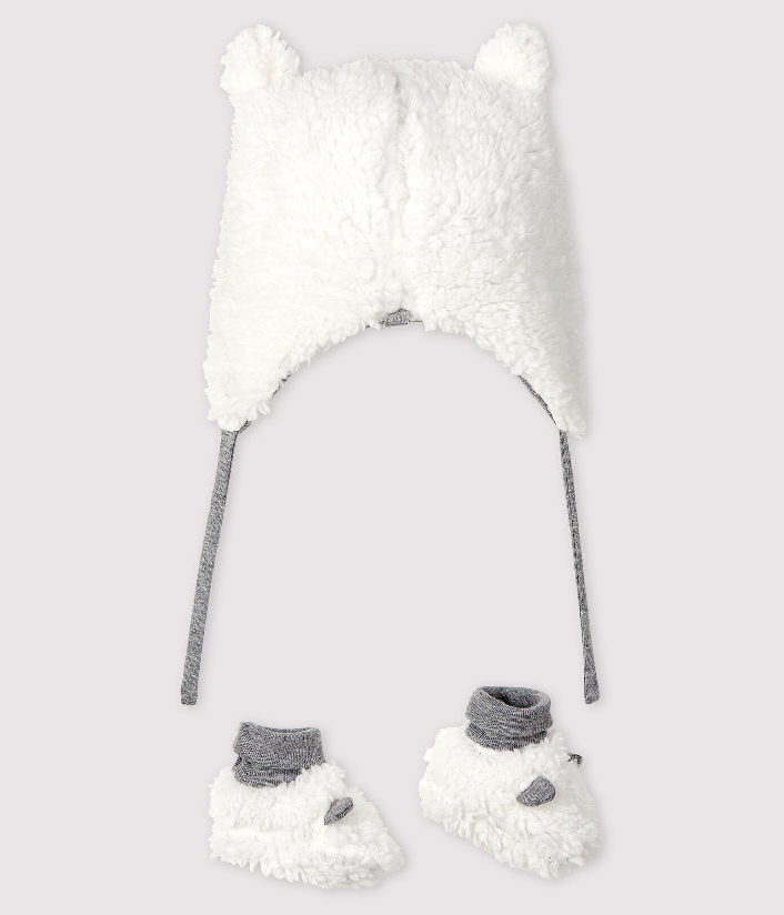 Шапочка на зав'язці та пінетки прикрашені милими вушками. Вироби створені зовні зі штучного хутра, а зсередини - натуральної бавовни. Сертифікований матеріал Oeko-Tex Standart 100 гарантує якість. Склад: 100% поліестер / 100% бавовна