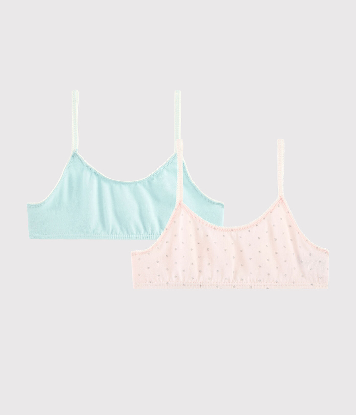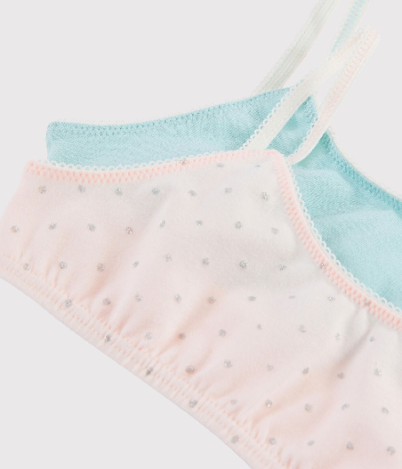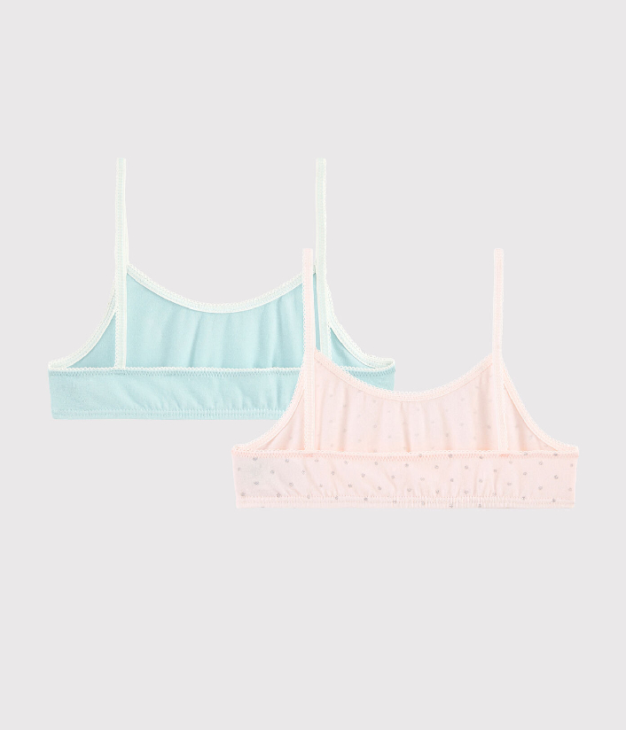 Набір з двома бралеттами для дівчинки. Трикотажний бюстгальтер без кісточок на бретелях надзвичайно зручний. Склад: 93% бавовна, 7% еластан