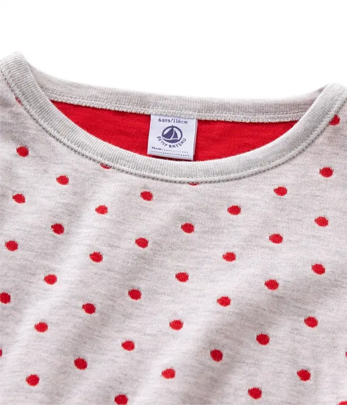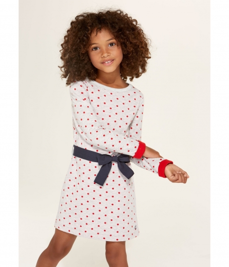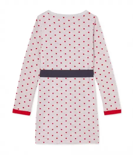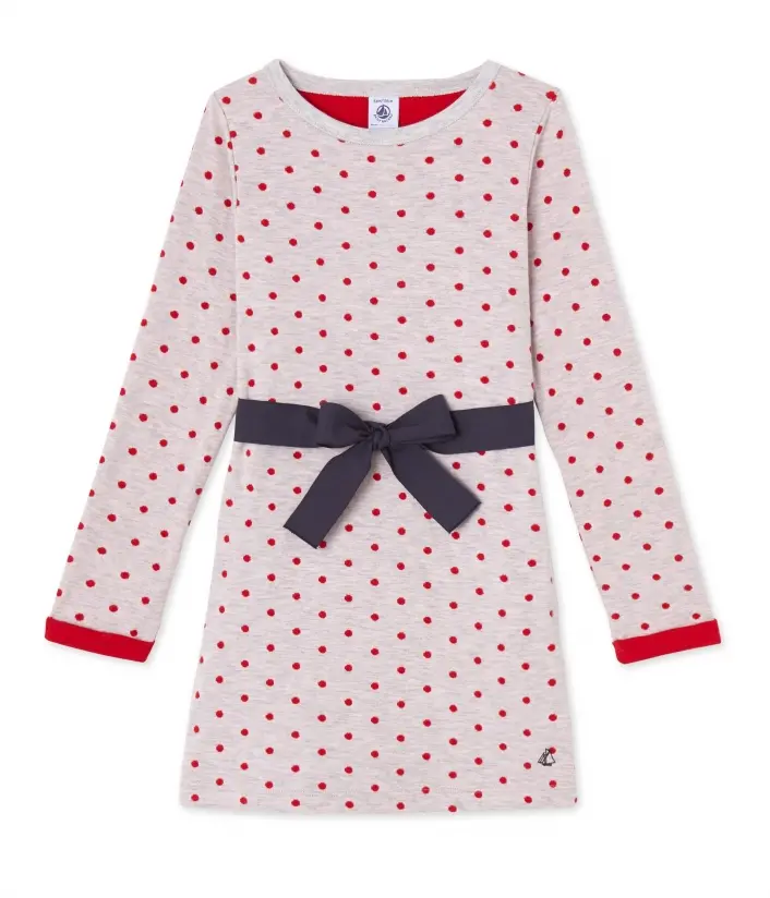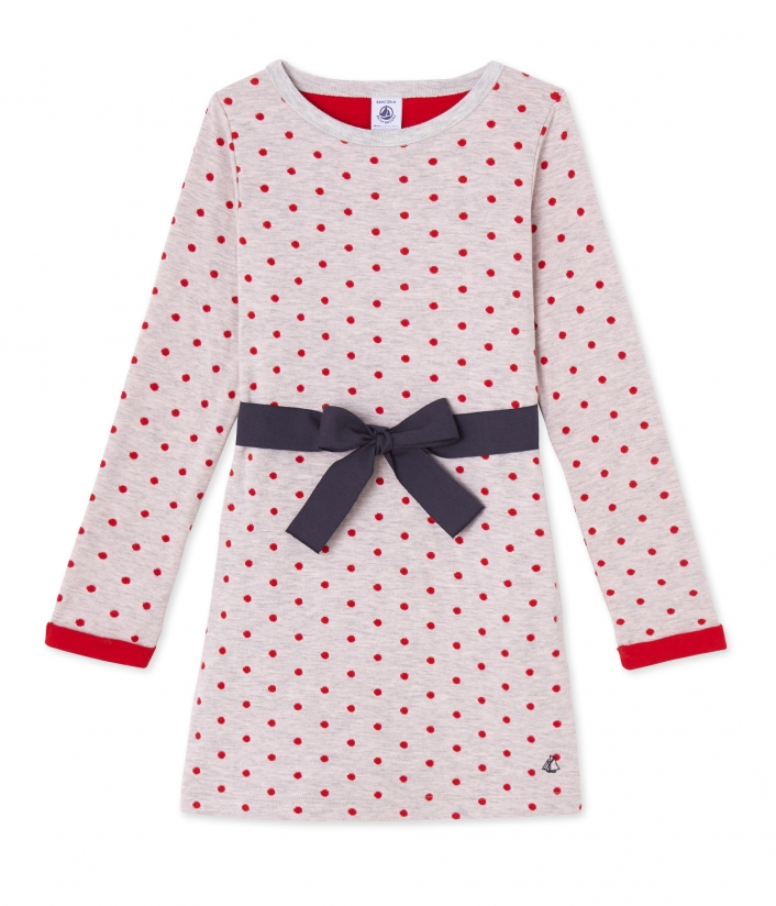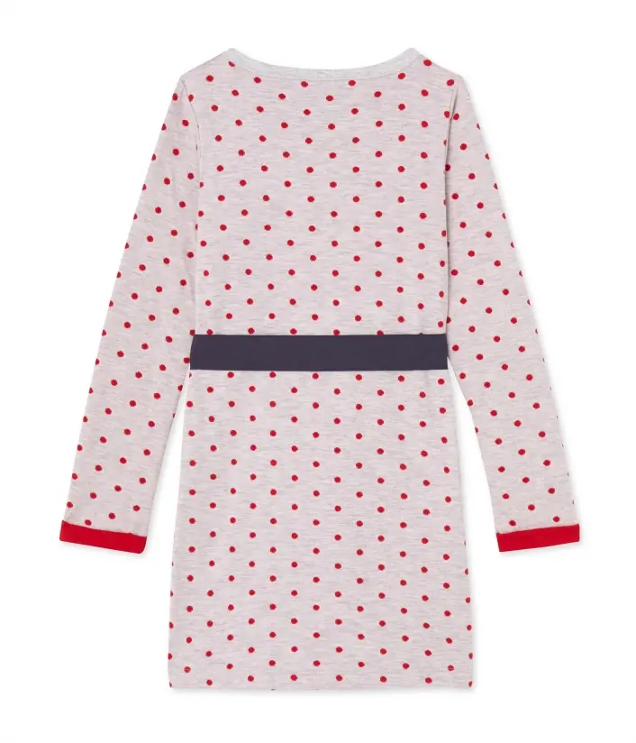 Платье с круглым вырезом и длинными рукавами, изготовленное из двухслойной ткани: снаружи - в горошек, изнутри - однотонная. Платье прямого кроя, декорировано контрастным поясом, который можно завязать бантиком. Материал: 100% хлопок.