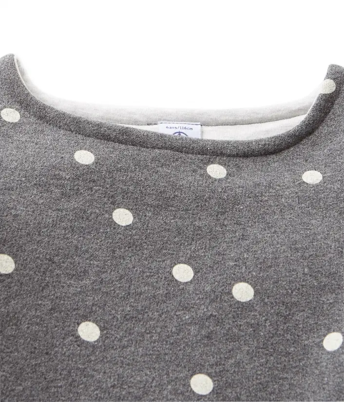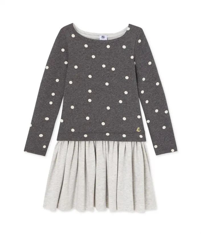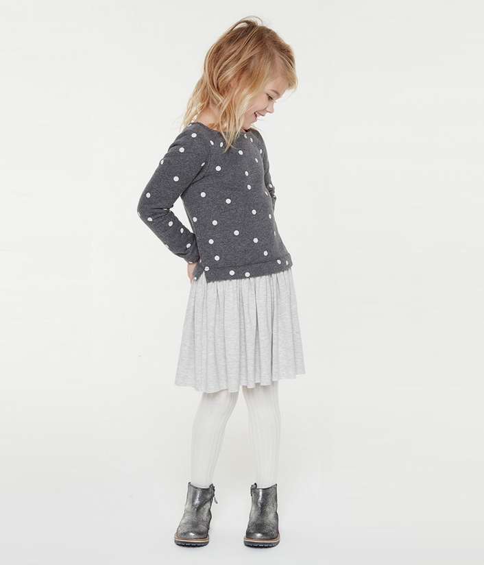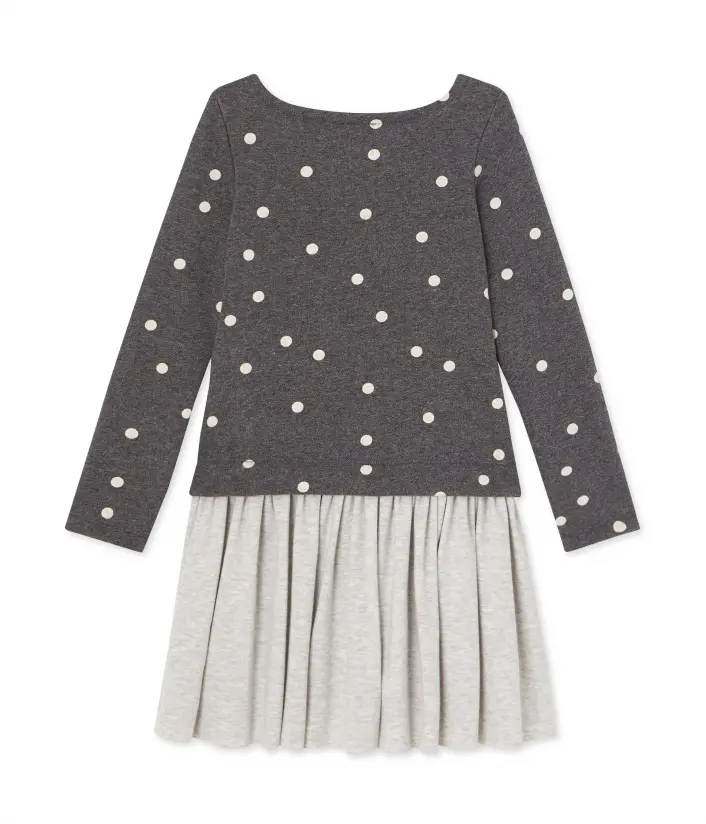 Сукня з глибоким вирізом та довгими рукавами, виготовлена з комбінованої тканини: верх із тканини в горошок, низ - із однобарвної тканини. Матеріал: 100% бавовна.