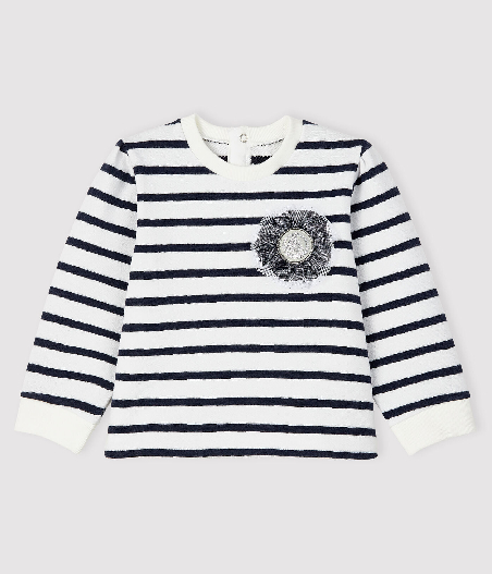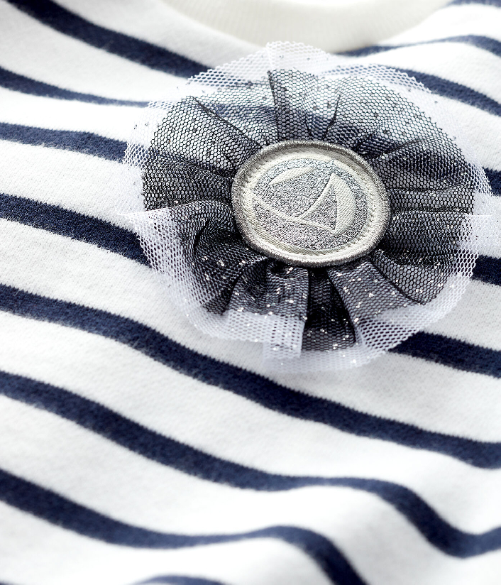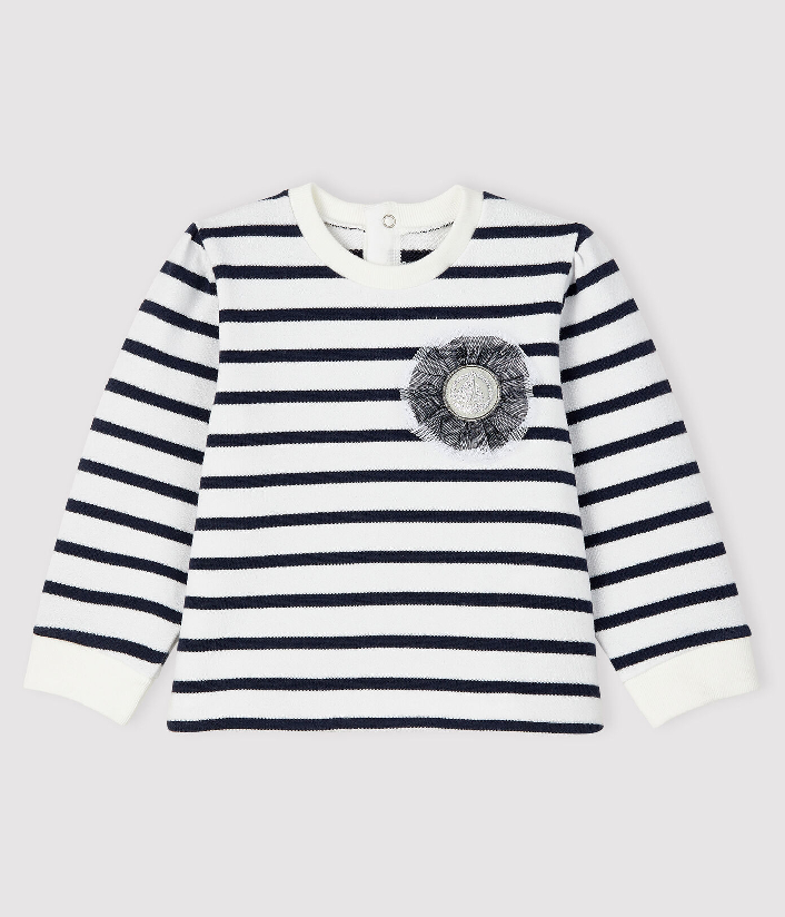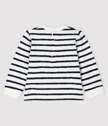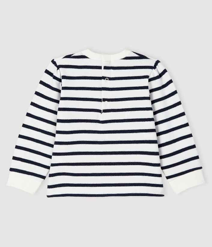 Світшот у смужку прикрашений нашивкою бантика з логотипом бренду Petit Bateau. Застібка на кнопочки ззаду. Склад: 100% бавовна