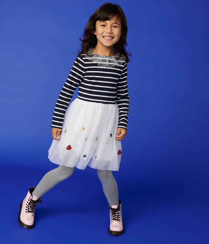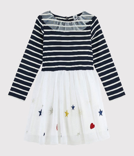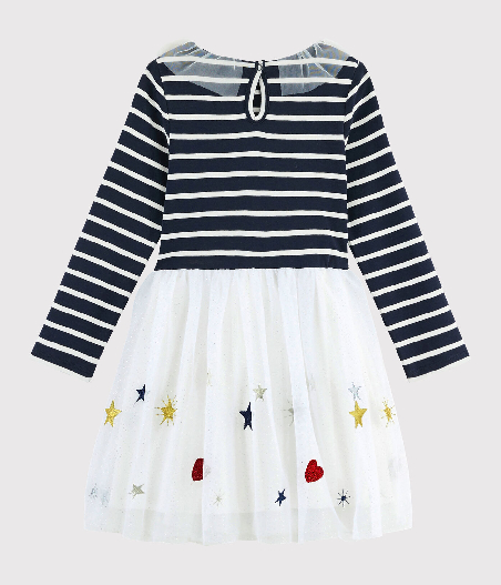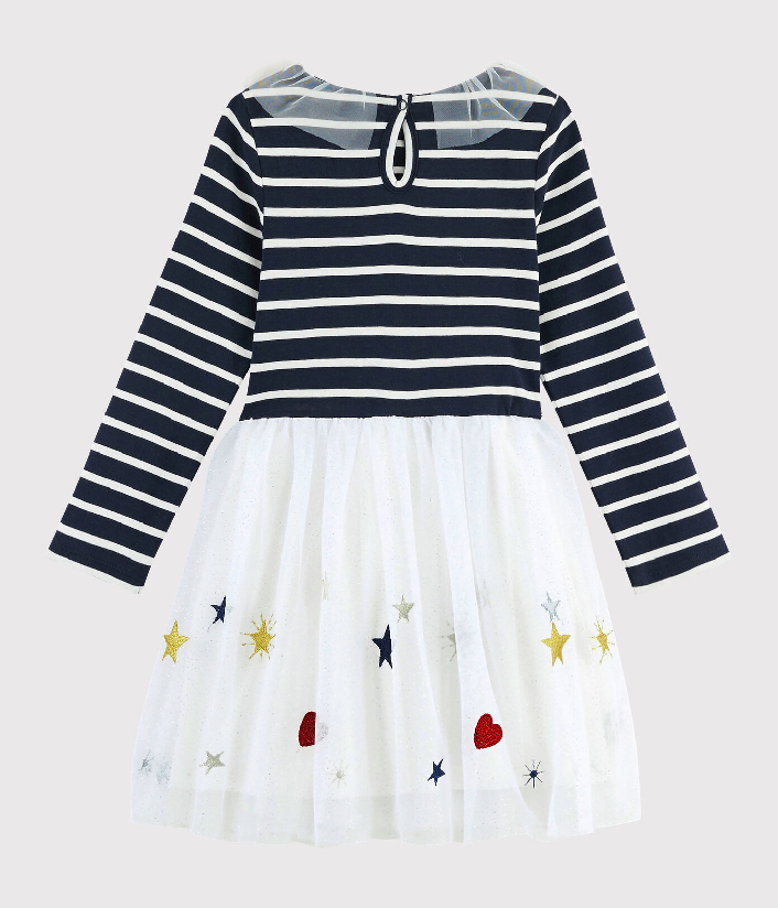 Стильна сукня для особливих подій. Верх прикрашений смужкою та білим коміром з фатину. Пишна спідниця декорована зірочками та сердечками. Застібка на кнопочку ззаду. Склад: 100% поліестер / 100% бавовна / 100% поліамід / 100% поліестер