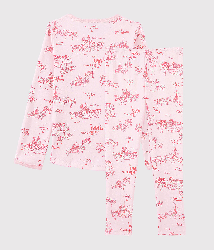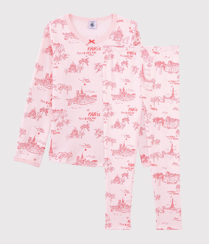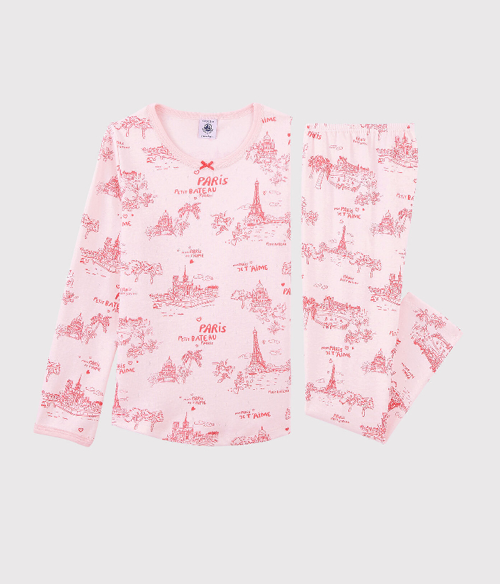 Пижама в стиле Туаль (фр. Toile de Jouy - «полотно с Жуи») украшена набивным монохромным рисунком. Хлопчатобумажная ткань Petit Bateau отмечена этикеткой OEKO-TEX®. Состав: 100% хлопок