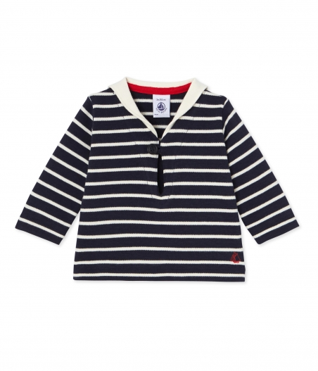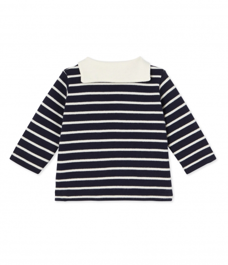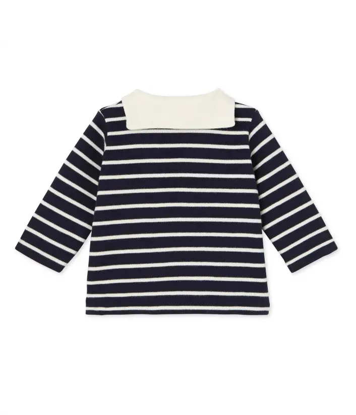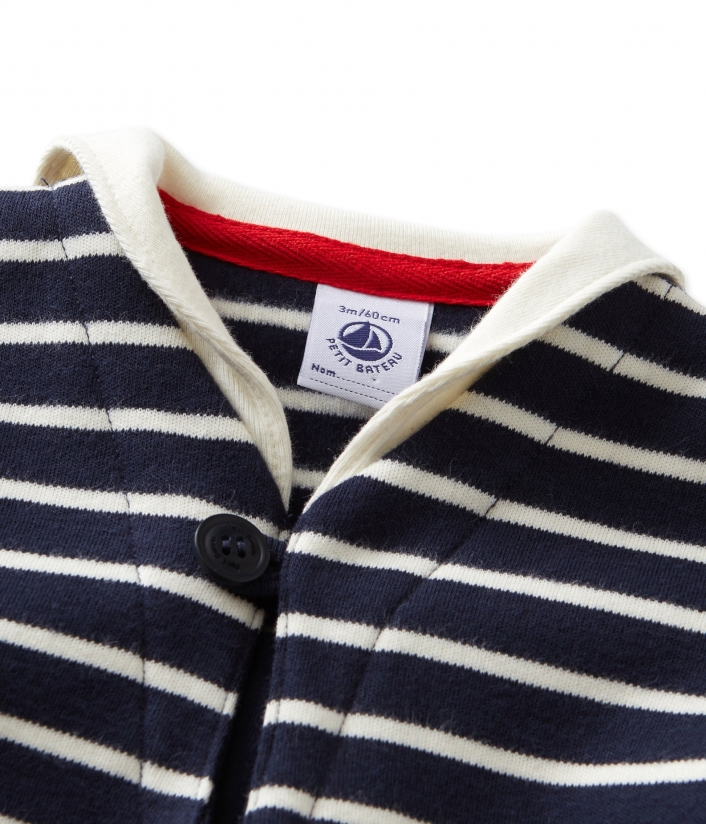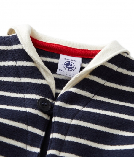 Кардиган для хлопчика, виготовлений з комфортної та теплої тканини в традиційну смужку Petit Bateau. Кардиган прикрашений білим комірцем у моряцькому стилі. Матеріал: 100% бавовна.