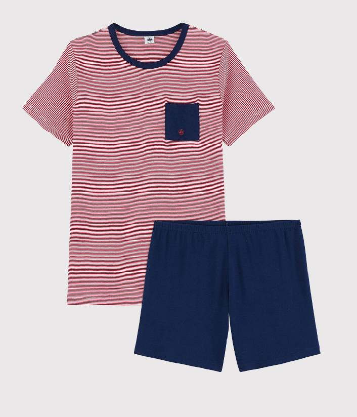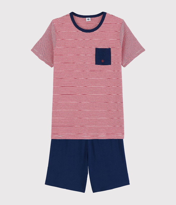 Футболка с короткими рукавами украшена полоской и карманом с принтом логотипа Petit Bateau. Шорты однотонного синего цвета. Пижама из хлопчатобумажной ткани Petit Bateau отмечена этикеткой OEKO-TEX®. Она мягкая на ощупь и комфортная к телу. Состав: 100% хлопок