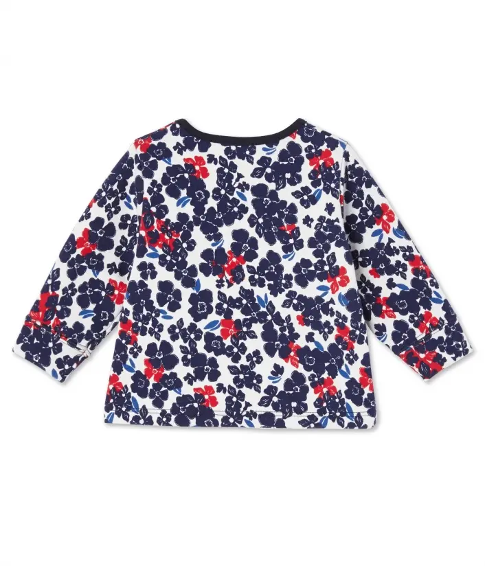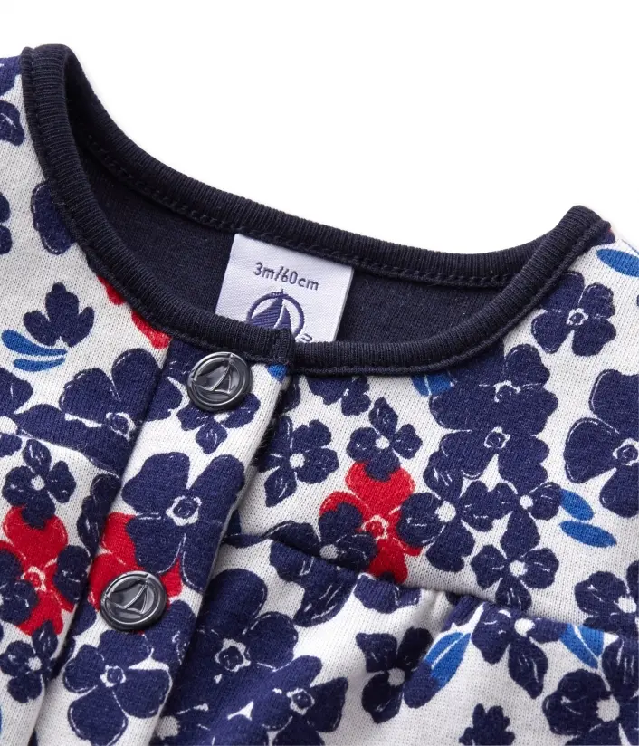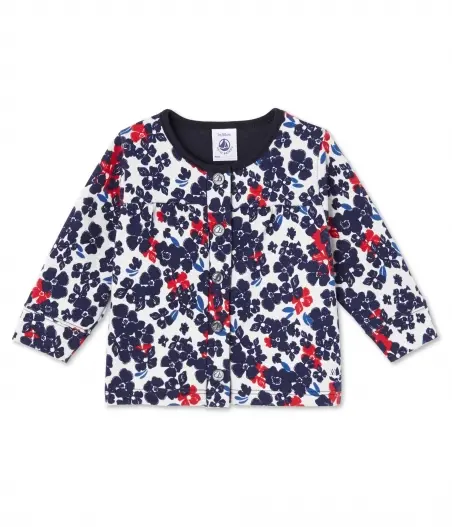 Кардиган для дівчинки, виготовлений з щільної тканини з гарним квітковим візерунком. Зверніть увагу на деталі: зборки на грудях, кнопки з зображенням кораблика Petit Bateau. Матеріал: 97% бавовна, 3% поліамід.