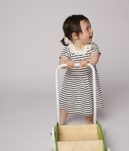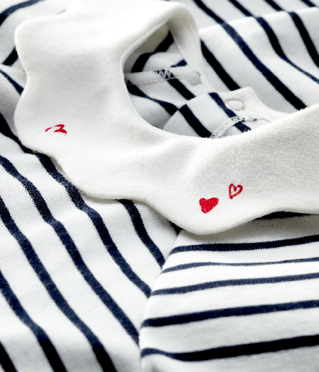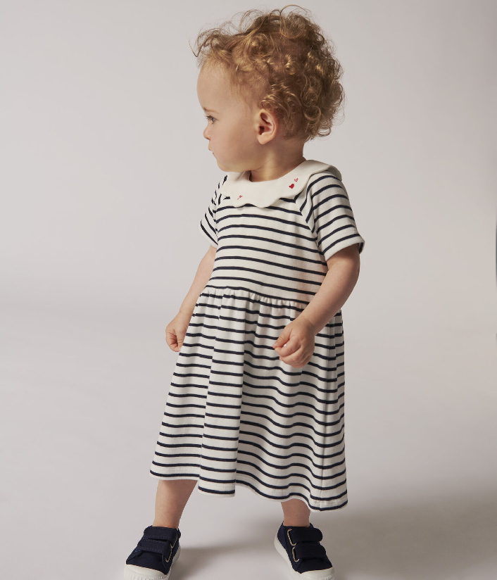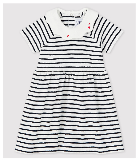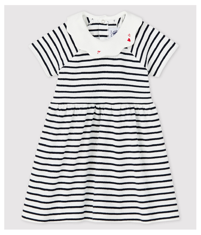 Платье с короткими рукавами украшено полоской, декорировано белым воротником с принтом сердца и надписью названия бренда Petit Bateau. Трикотажное платье комфортное, не сковывает движений. Застежка на кнопочки. Состав: 100% хлопок