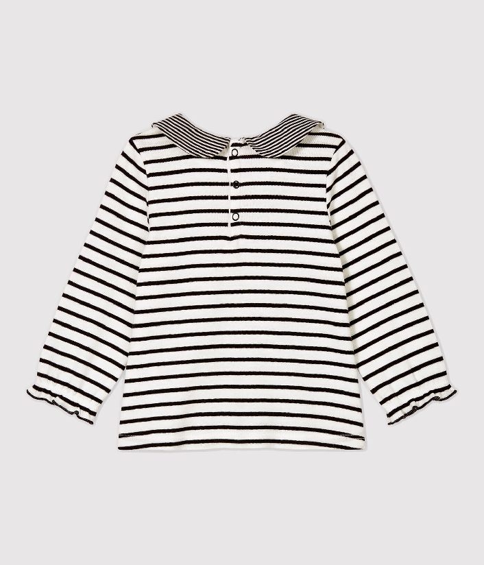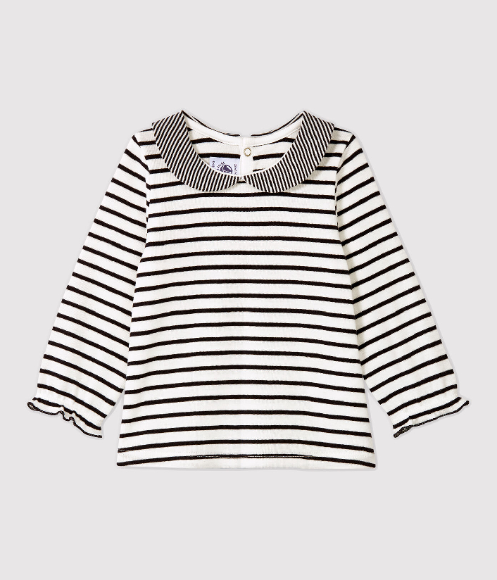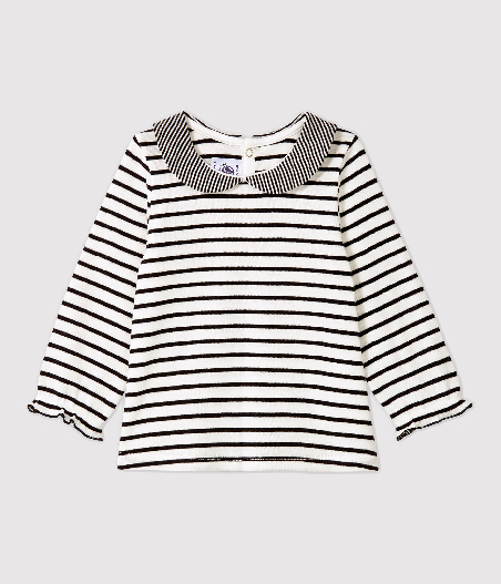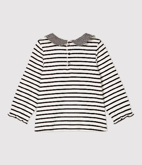 Блуза з довгими рукавами для дівчинки. Комір в стилі "Пітер Пен" прикрашає виріб. Застібка на кнопочку ззаду. Будьте в тренді з Petit Bateau. Склад: 100% бавовна