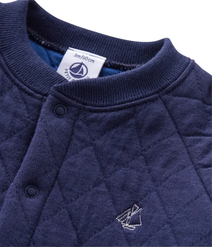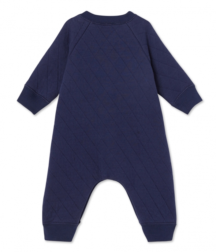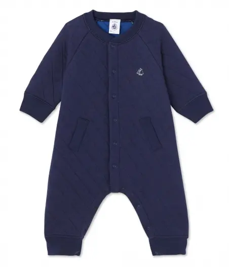 Теплий стьобаний комбінезон з манжетами на рукавах та брюках. Має зручну систему застібок на кнопки, оздоблений двома маленькими кишенями спереду. Матеріал: 75% бавовна, 25% поліестер.