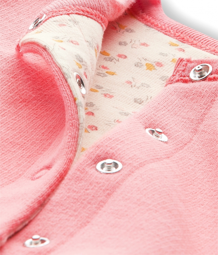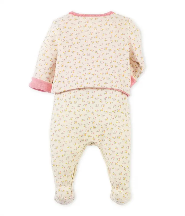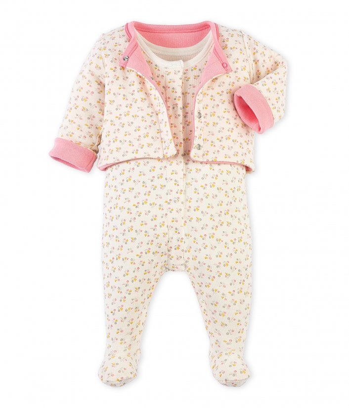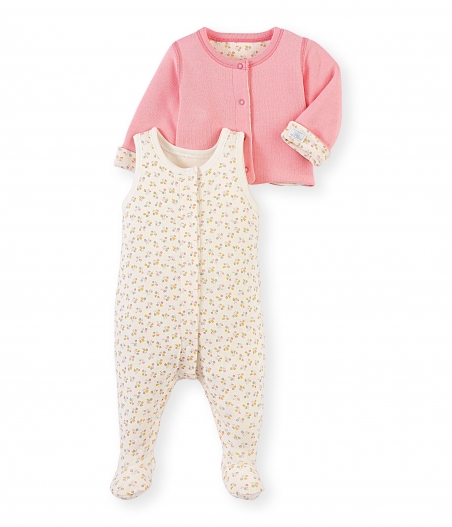 Набор для девочки, состоящий из комбинезона с длинными рукавами и двустороннего кардигана. Комбинезон и одна из сторон кардигана изготовлены из ткани с цветочным узором; другая сторона кардигана изготовлена из однотонного теплого флиса. Материал: 100% хлопок.