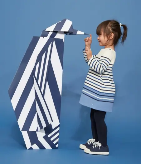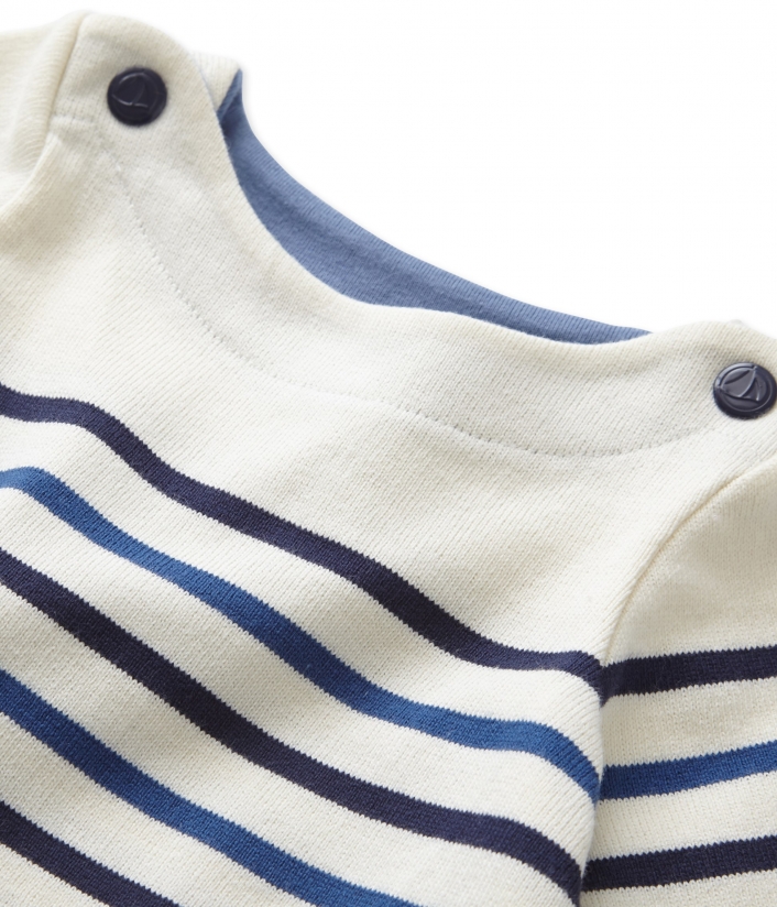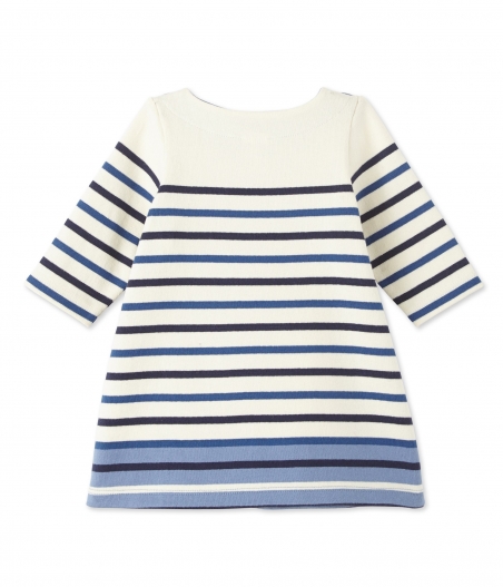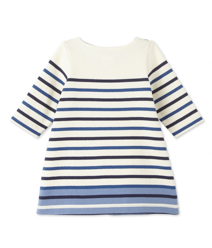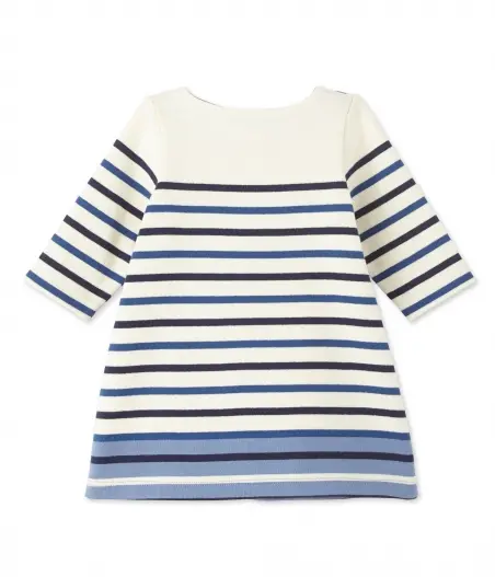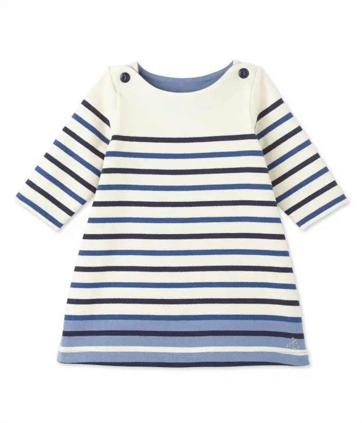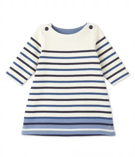 Дитяча сукня з довгими рукавами, виготовлена з щільного трикотажу в різнокольорову смужку. Сукня має А-подібний силует та круглий виріз із кнопками на плечах. Матеріал: 100% бавовна.