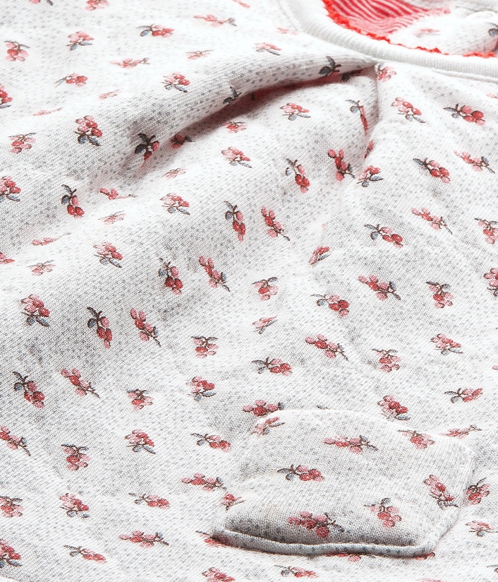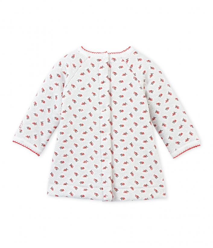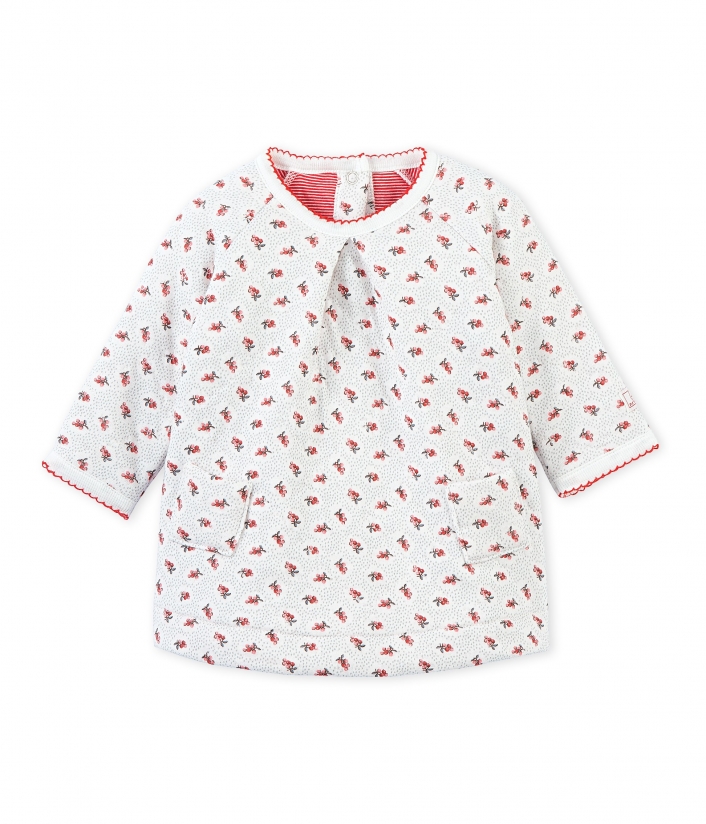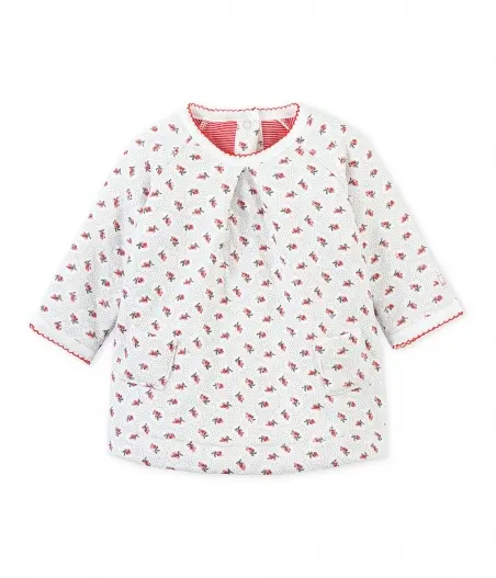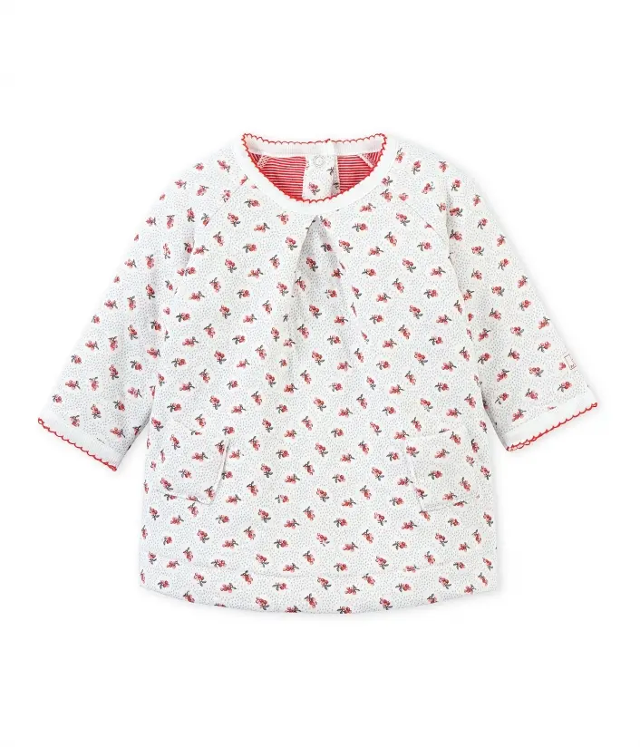 Простора сукня з довгими рукавами для дівчинки, зроблена з м'якої подвійної тканини. Зовні сукня прикрашена візерунком у вигляді зимових ягід. Підкладка сукні виготовлена з традиційної тканини Petit Bateau в дрібну смужку. Матеріал: 75% бавовна, 25% поліестер.