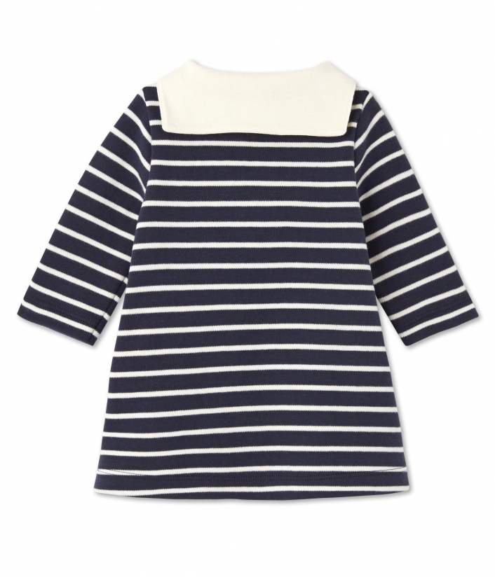 Сукня з довгими рукавами для дівчинки, виготовлена з комфортної та теплої тканини в традиційну смужку Petit Bateau. Сукня прикрашена білим комірцем у моряцькому стилі. Матеріал: 100% бавовна.