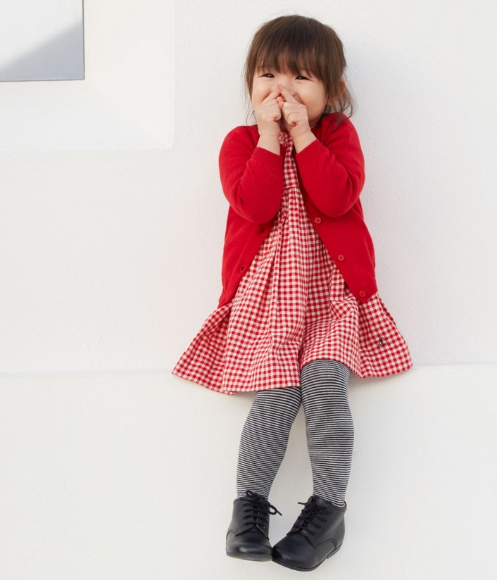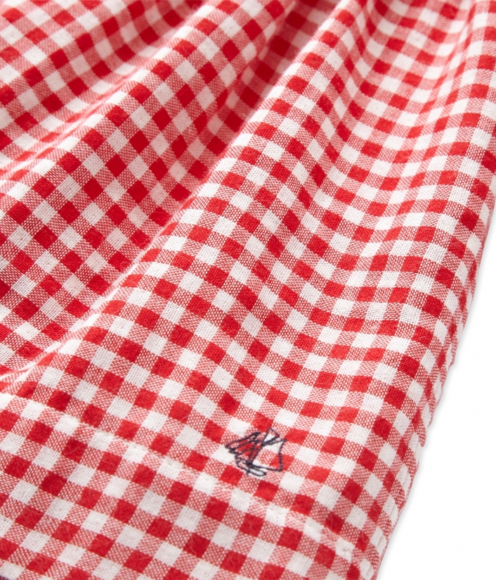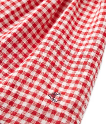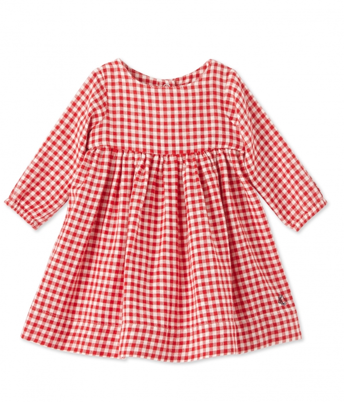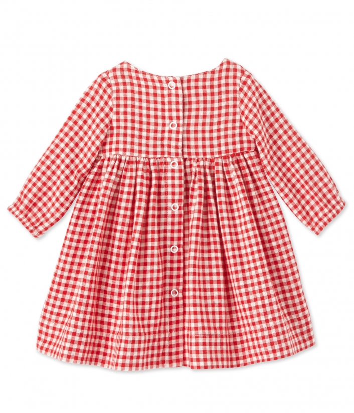 Простора сукня з довгими рукавами, виготовлена з бавовняної тканини в дрібну клітинку. Сукня оздоблена застібкою на кнопки по всій довжині спинки. Матеріал: 100% бавовна.