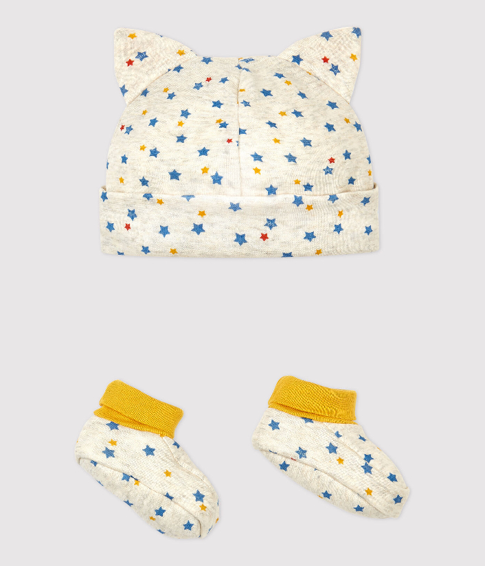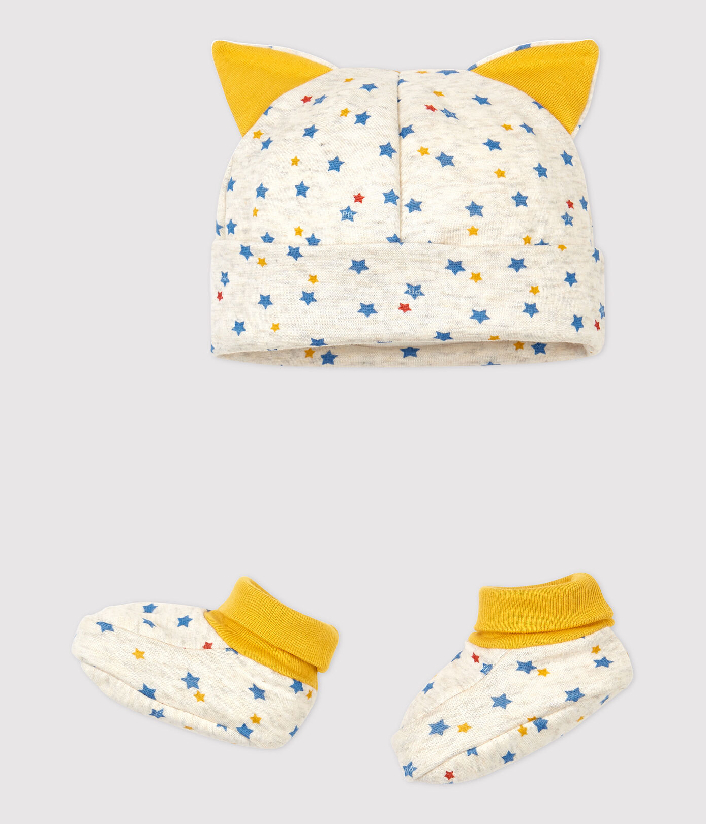 Теплая трикотажная шапочка с пинетками декорированы звездочками. Пинетки легко одеваются. Органический хлопок Petit Bateau отмечен этикеткой OEKO-TEX®. Состав: 85% хлопок, 9% шерсть, 6% полиамид / 100% хлопок