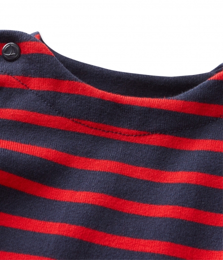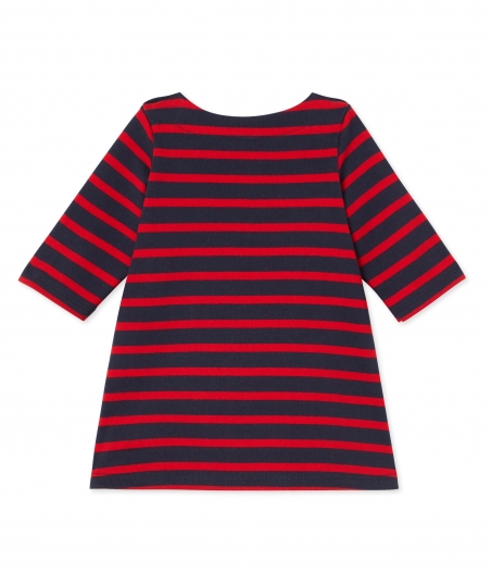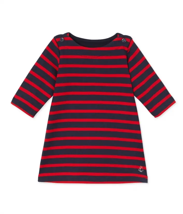 Дитяча сукня з довгими рукавами, виготовлена з щільного трикотажу в смужку. Сукня має А-подібний силует та круглий виріз із кнопками на плечах. Матеріал: 100% бавовна.