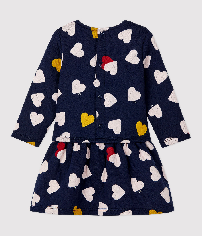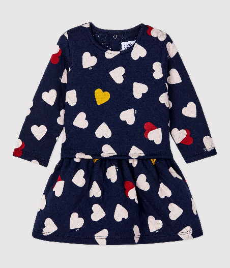 Тепла трикотажна сукня з довгими рукавами прикрашена сердечками. Застібка на кнопочки ззаду. Склад: 75% бавовна, 25% поліестер