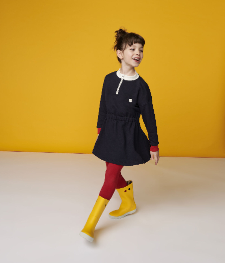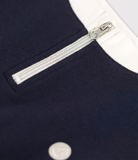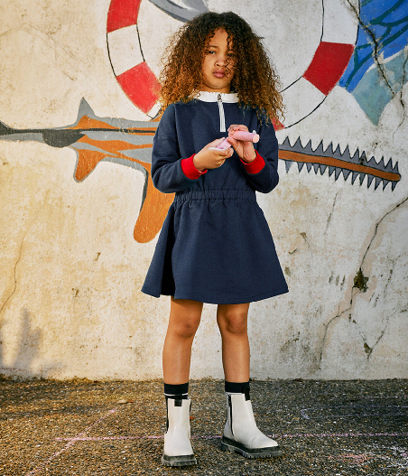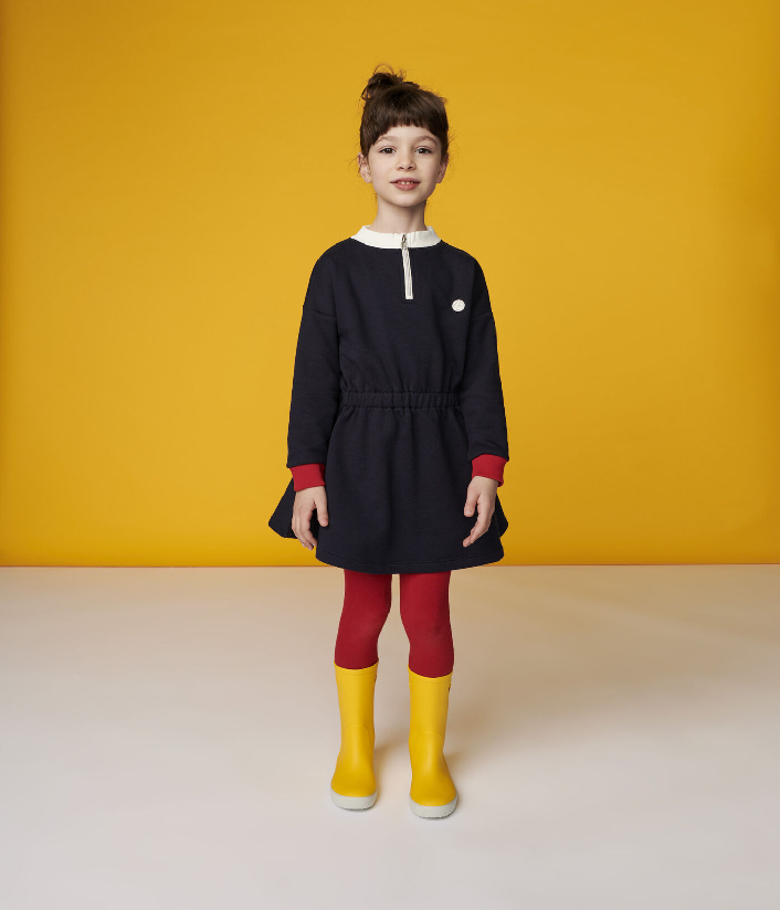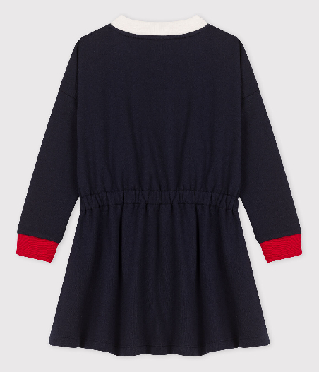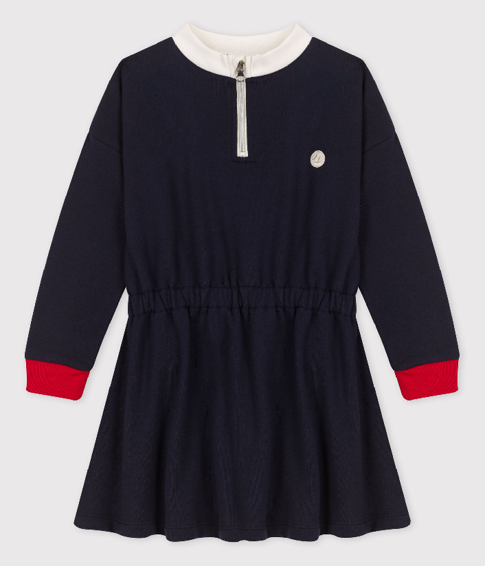 Трикотажна сукня прикрашена принтом вітрильника Petit Bateau та контрастними різнокольоровими вставками. Застібка-блискавка спереду. Склад: 100% бавовна
