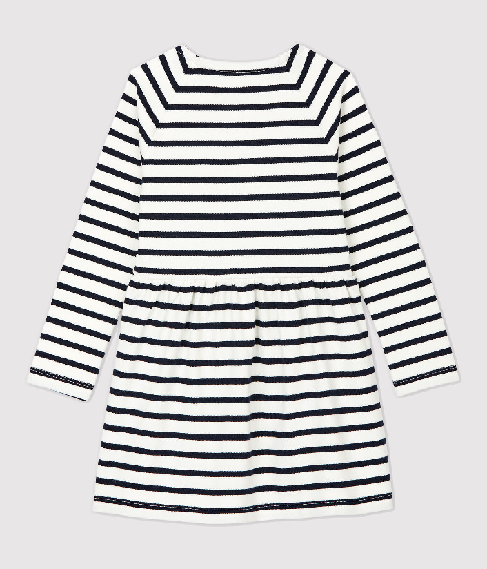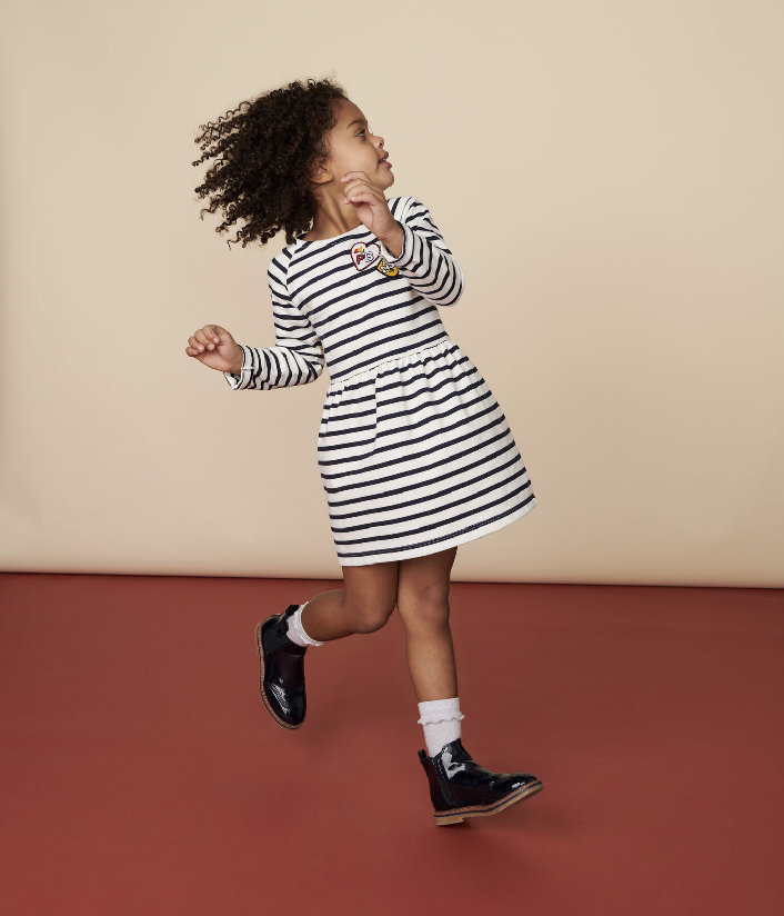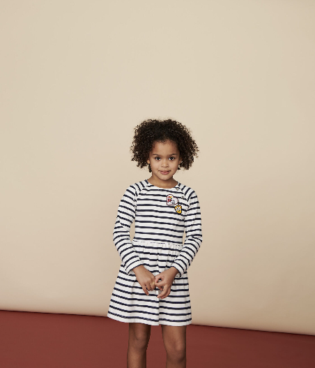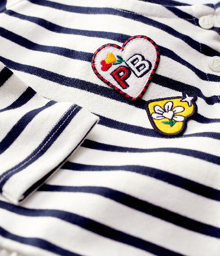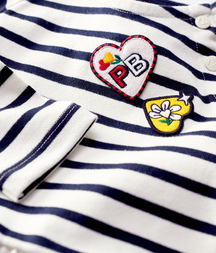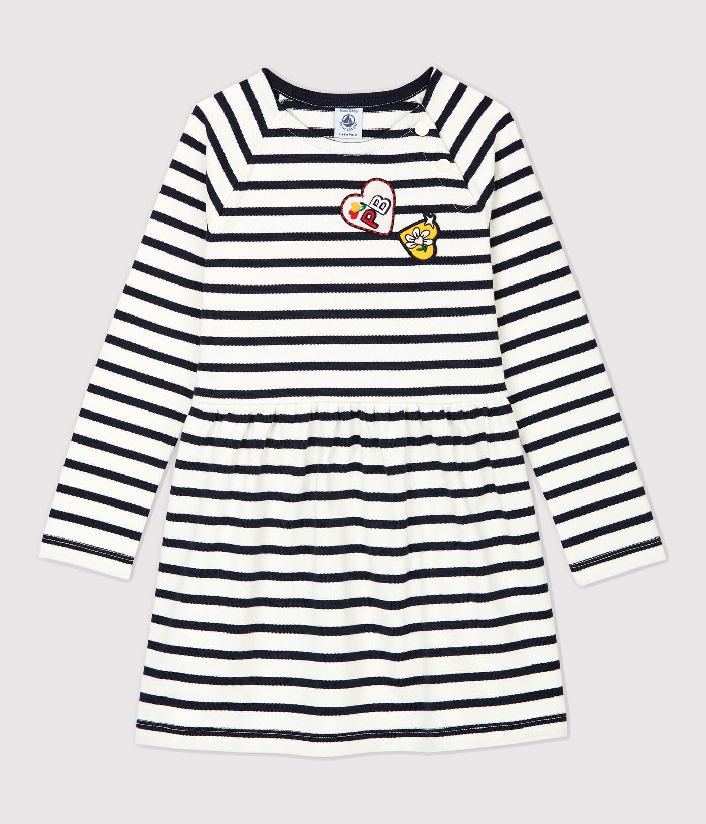 Трикотажна сукня прикрашена смужкою та креативною нашивкою у формі сердечок. Застібка на кнопочки. Склад: 100% бавовна