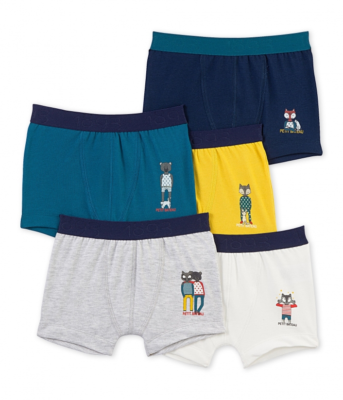 Набір з п'яти боксерів з малюнком для хлопчика. Кожна пара має еластичний пояс контрастного кольору. Матеріал: 93% бавовна, 7% еластан.