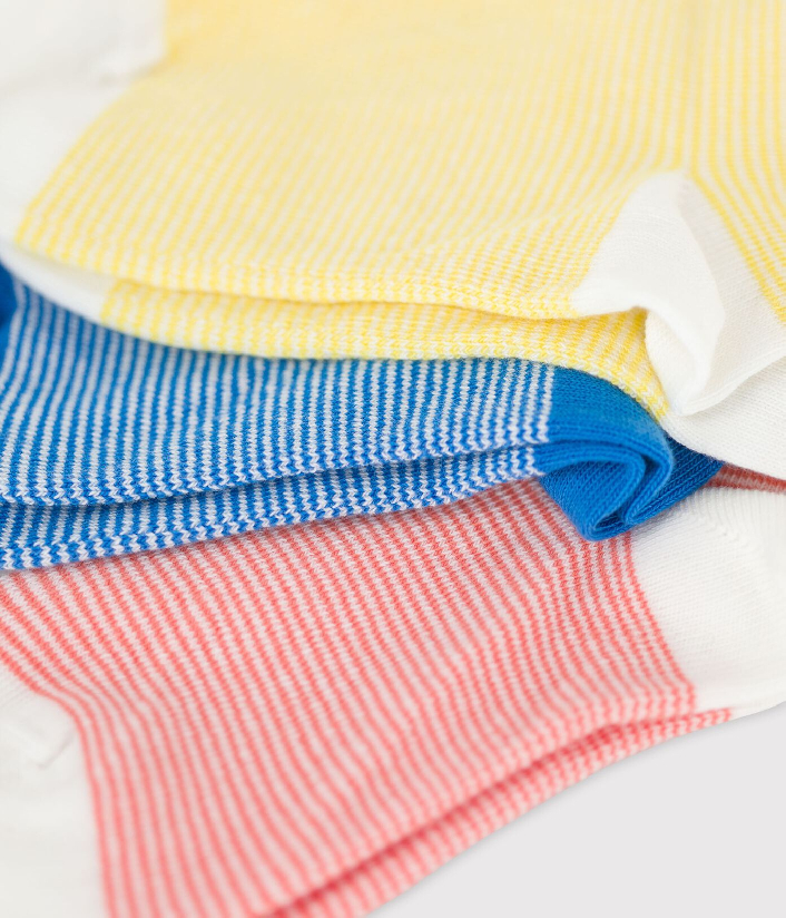 Три пари різнокольорових шкарпеток у смужку. Довжина ступні: 23/26 = 14,6-16,1 см; 27/30 = 17,2-18 см; 31/34 = 19,6-21,3 см; 35/38 = 22,8-23,8 см. Склад: 79% бавовна, 19% поліамід, 2% еластан
