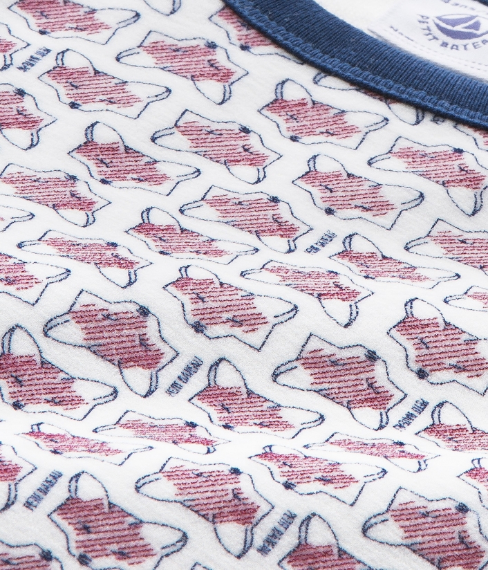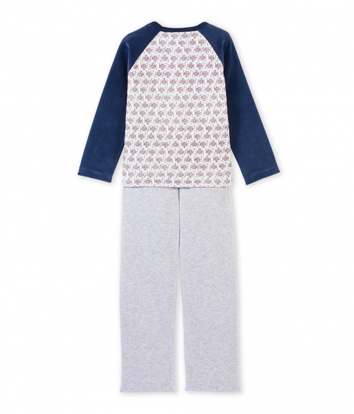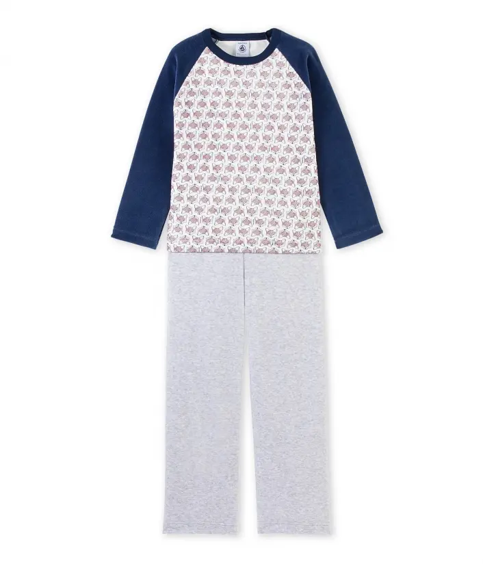 Велюрова піжама з довгими рукавами для хлопчика, прикрашена принтом у вигляді лисичок на грудях та спині. Рукава футболки виготовлені з тканини контрастного кольору. Матеріал: 75% бавовна, 25% поліестер / 80% бавовна, 20 поліестер.