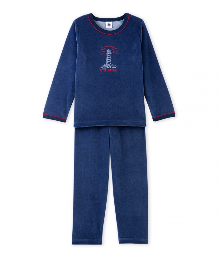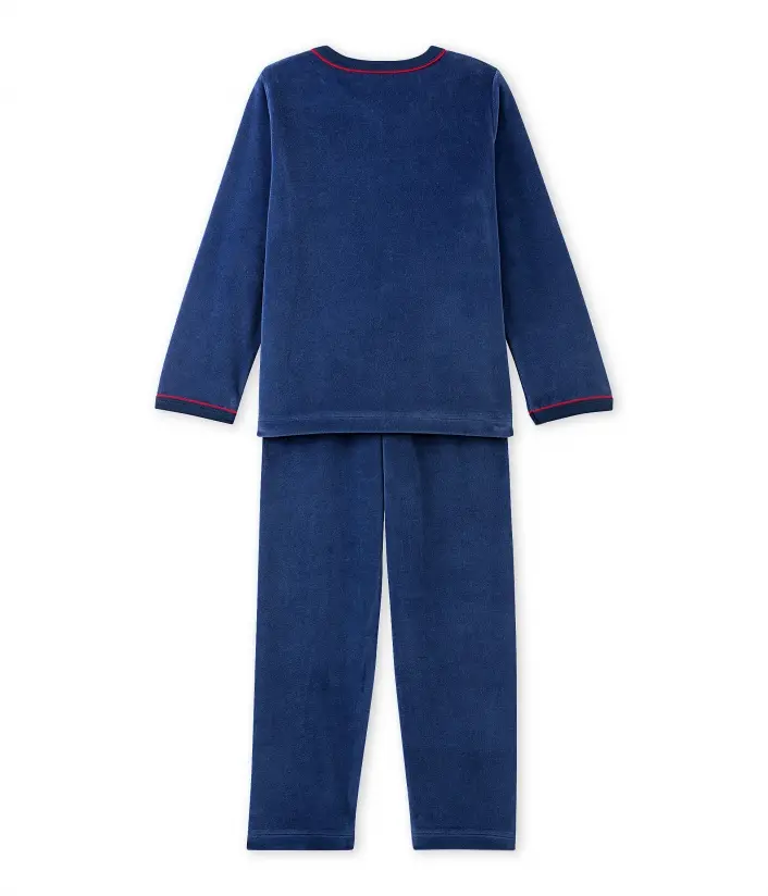 Велюровая пижама с длинными рукавами для мальчика, украшенная крупным рисунком на груди. Вырез и манжеты декорированы отделкой контрастного цвета. Материал: 80% хлопок, 20% полиэстер.