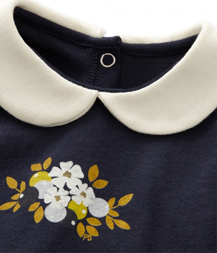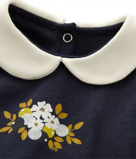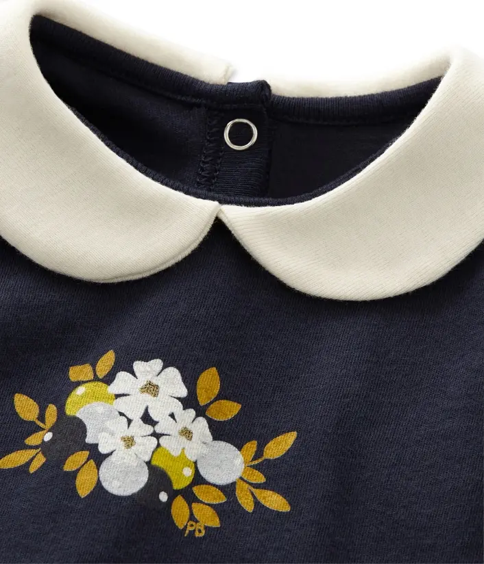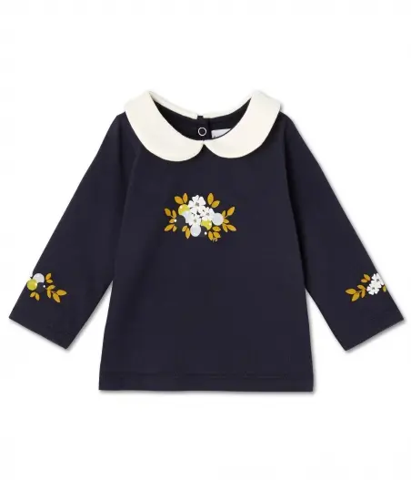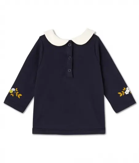 Блуза с длинными рукавами для девочки, украшена чудесным цветочным принтом на груди и рукавах. Белый воротничок в стиле "Питер Пэн" придает блузе женственности. Блуза имеет удобные застежки на спинке для комфортного и быстрого переодевания. Материал: 100% хлопок.